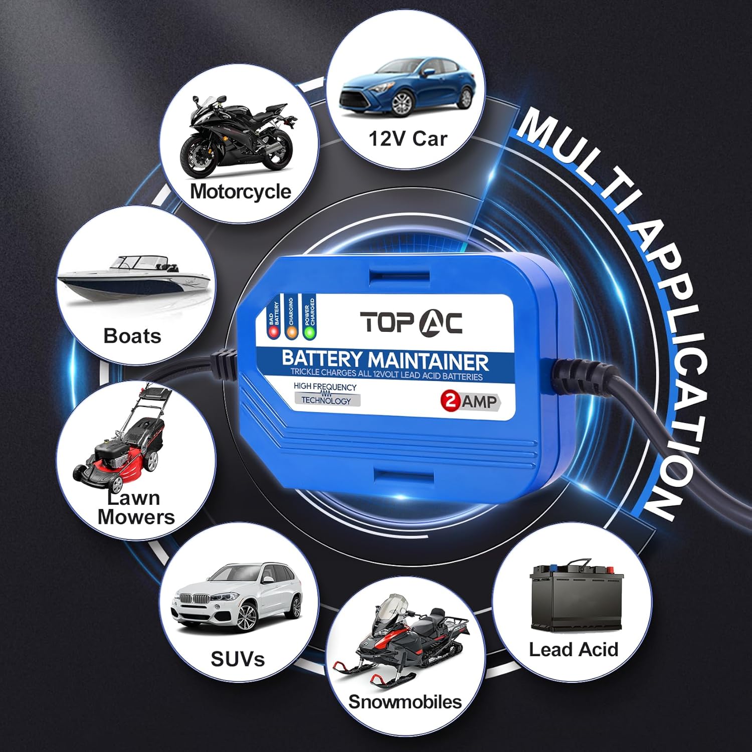 2 Amp Car Battery Charger,12V Smart Fully Automatic Battery Charger Maintainer Trickle Charger and Float Charger for Car Truck Motorcycle Lawn Mower Boat, Lead Acid Batteries