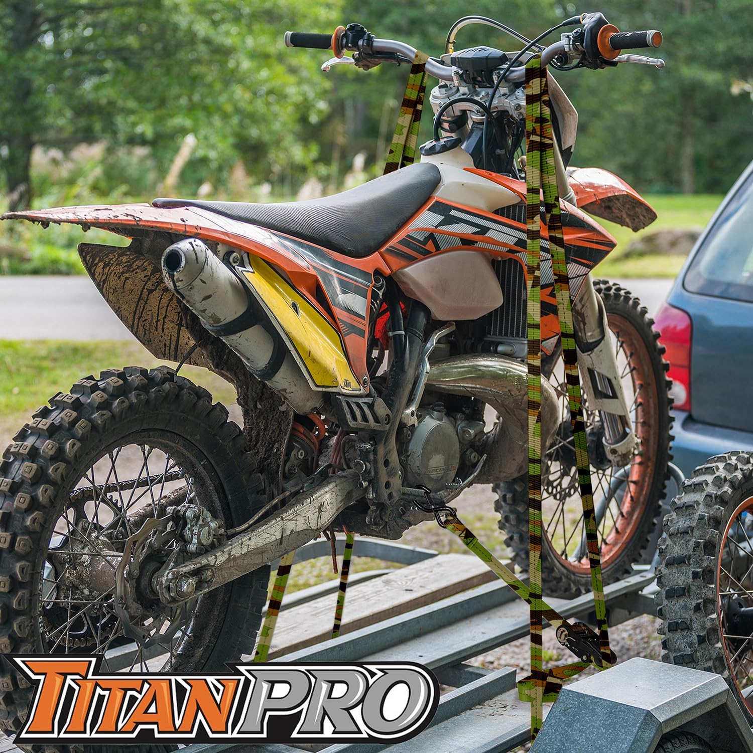 - VERSATILE APPLICATIONS: From motorcycle ramps to side-by-side accessories and tow truck equipment, TitanPro Ratchet Tie Down Straps are the go-to choice for securing cargo, offering flexibility, strength, and reliability for all your tie-down needs.
