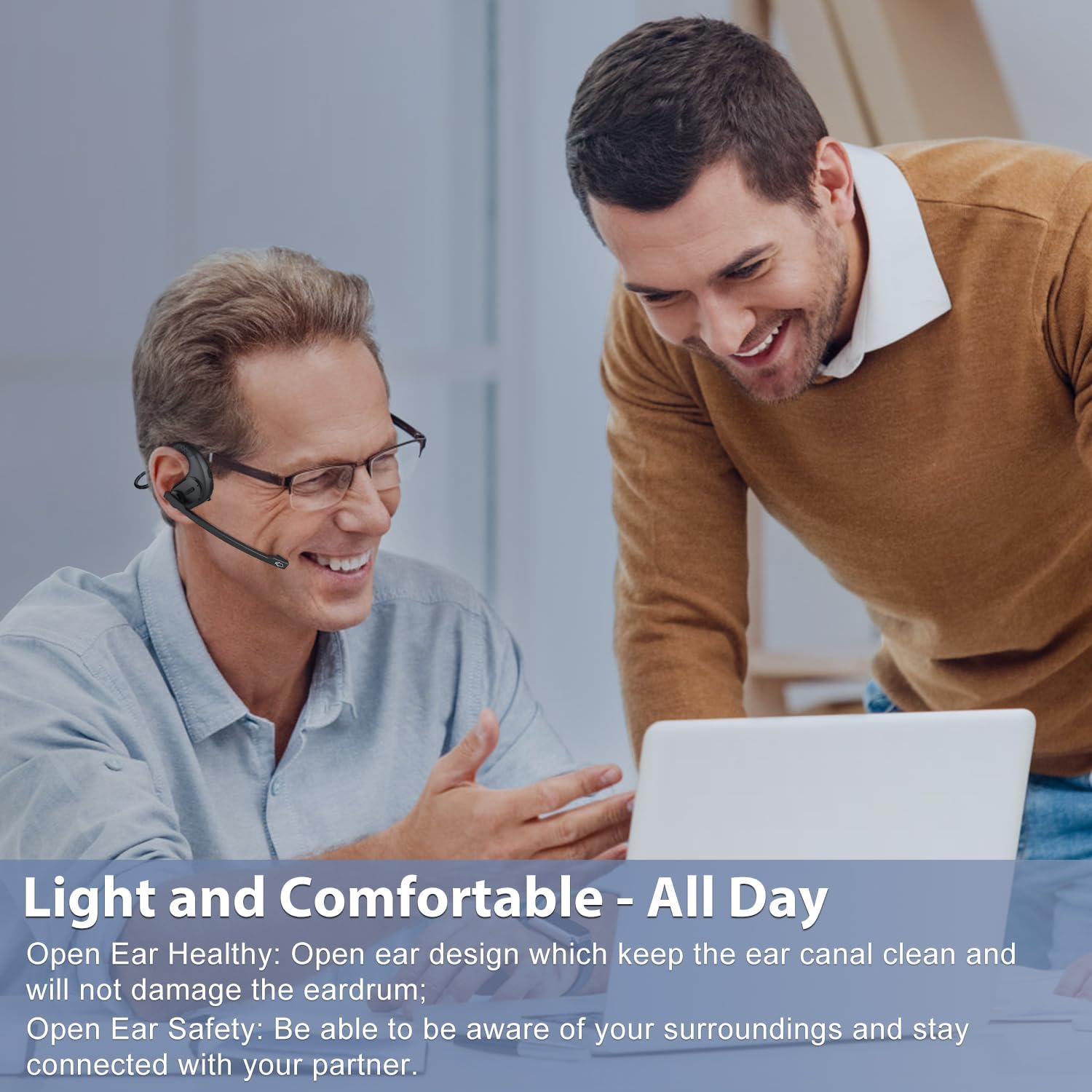 - [LIGHTWEIGHT AND COMFORTABLE ALL DAY] The wireless Office headphones' lightweight and ergonomic design ensures comfort all day long without ear ache. Silicone ear hooks and ear cushions make both sides flexibly attached, very balanced and stable so you won't have to worry about falling off; 360° non-deformable memory steel wire headband won't leave marks in your hair; weighing only 28g, it's super lightweight and won't compress your ears or interfere with your glasses, you'll almost forget you're wearing it.