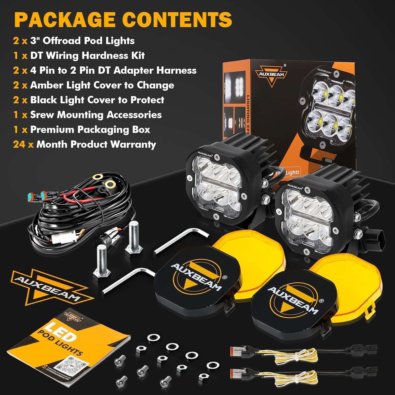- 【Buy with Confidence】2 x 3 inch pod light, 2 x white light cover, 1 x 10ft DT wiring harness, 1 x installation accessories kit and 1x exquisite package gift box. No need to purchase additional wiring harness or plug. 24-month product warranty and 24-hour after-sales service, please contact Auxbeam customer service at any time.