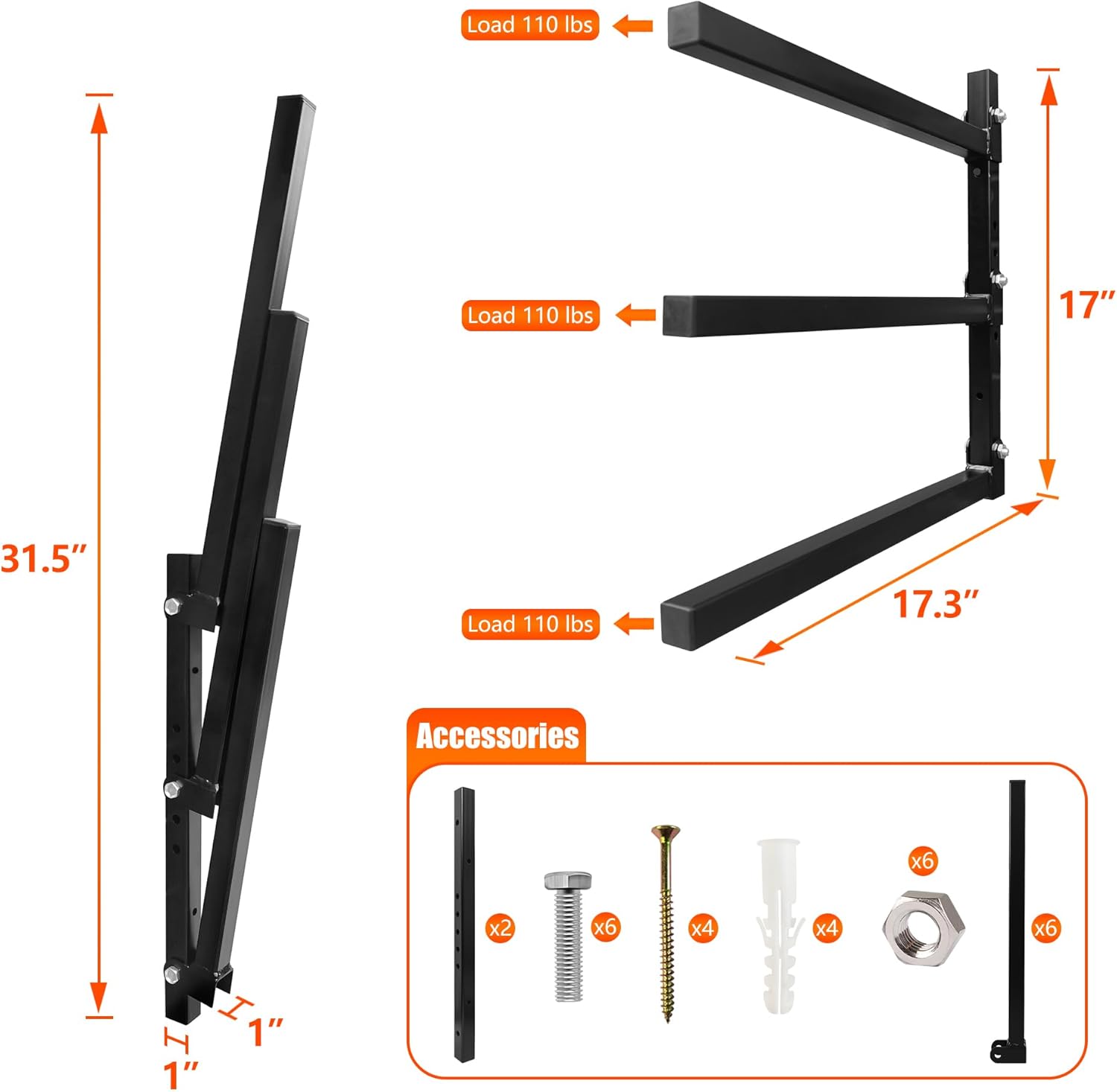 - ăSUFFICIENT LOAD-BEARING CAPACITY AND STORAGE SPACEăEach shelf of this lumber storage metal rack can bear a maximum load of 110 pounds, with a total capacity of 330 pounds. Its size is 17''(43.2cm) height, 47''~70''(120cm~180cm) wide, 17.3''(43.9cm) shelves. The spacing between each layer is 6.25 inch(160 mm), and the spacing can be adjusted. This lumber storage rack wall mounted can easily meet the daily storage needs of your family or business.