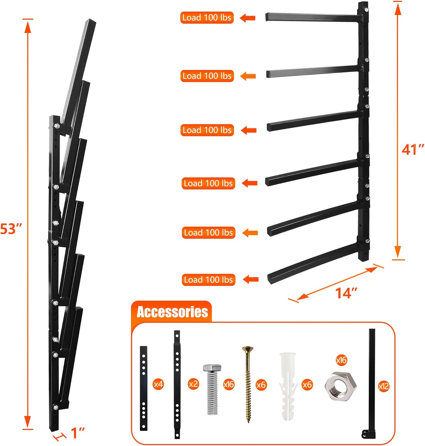 - ăSUFFICIENT LOAD-BEARING CAPACITY AND STORAGE SPACEăEach shelf of this lumber storage metal rack can bear a maximum load of 110 pounds, with a total capacity of 600 pounds. Its size is 41''(104.14cm) height, 48''~72''(121.92cm~181.88cm) wide, 12.5''(31.75cm) shelves. The spacing between each layer is 6.25 inch(160 mm), and the spacing can be adjusted. This lumber storage rack wall mounted can easily meet the daily storage needs of your family or business.