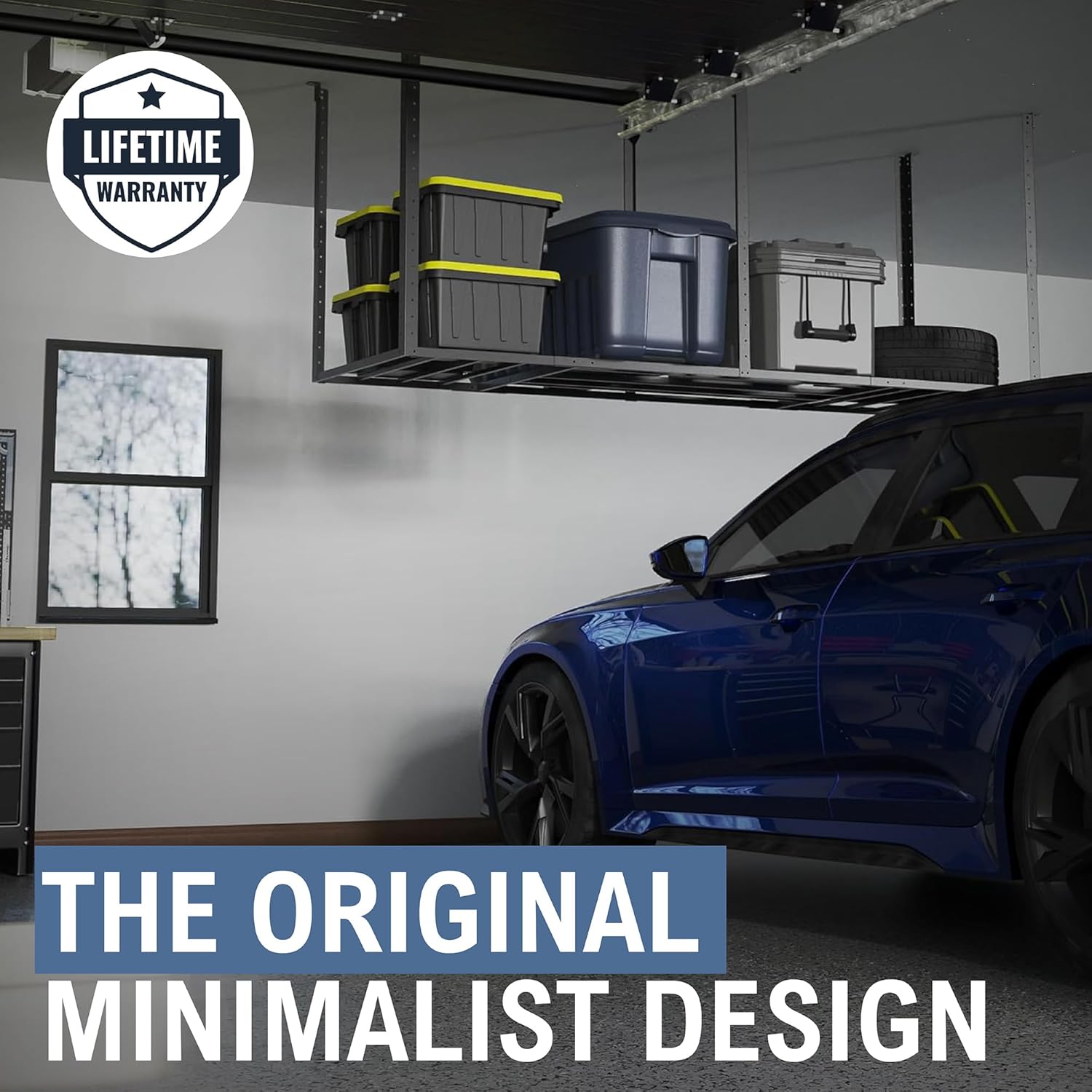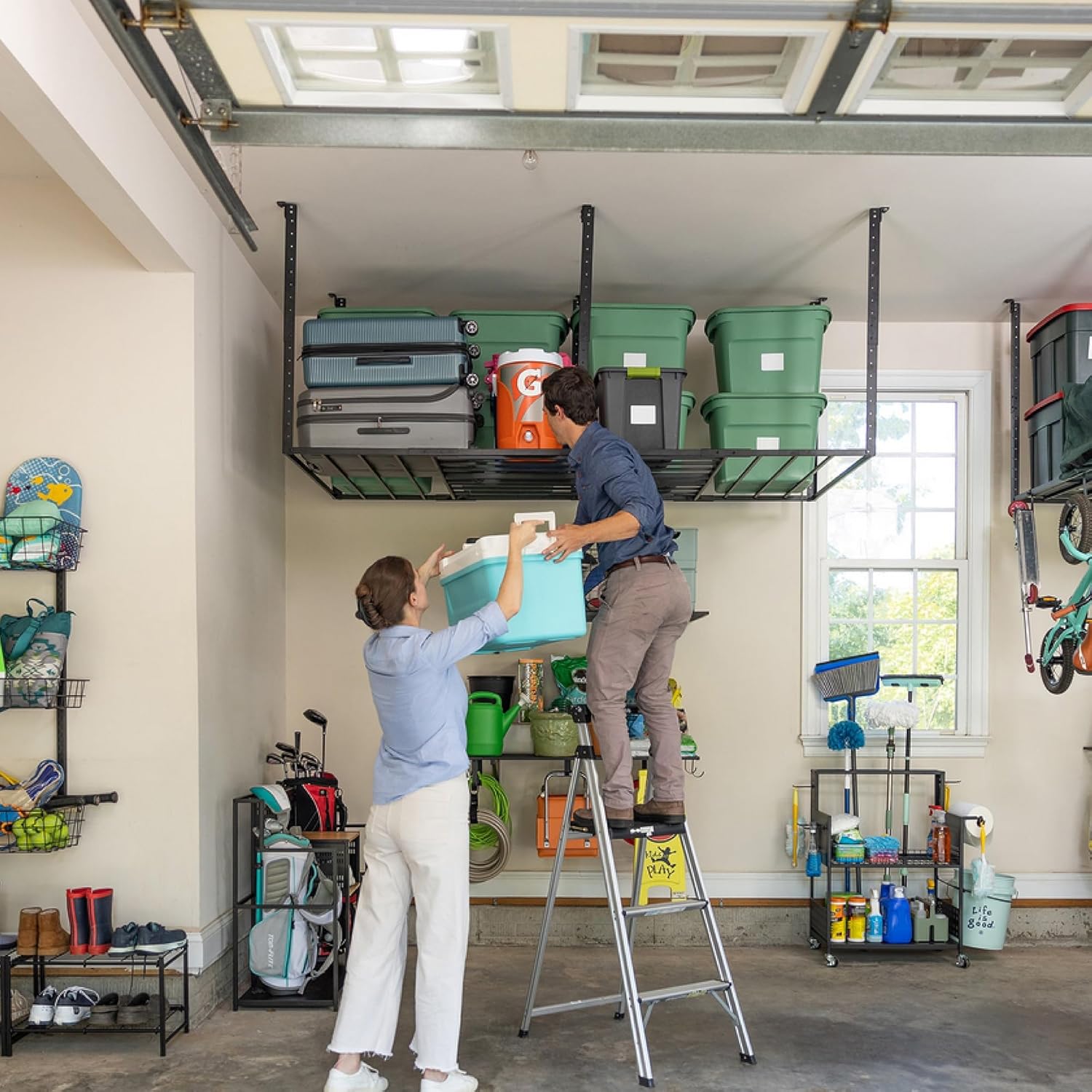 - 4 X 8 FT Garage Storage System: Utilize overhead storage space to store bins, luggage, tires, decoradtions, and more for ultimate garage organizing. Clear up floor space with this 96 in. x 48 in. x 40 in. ceiling storage rack.
