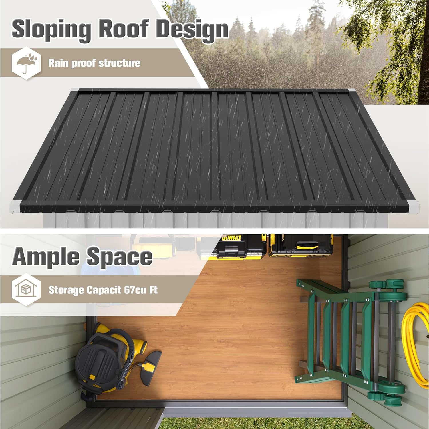 - Rainproof roof and locking doors: The roof is scientifically pitched to prevent the infiltration and accumulation of rain and snow, and lockable doors can deter animals and thieves from entering, Ensure the safety of your items and your privacy.