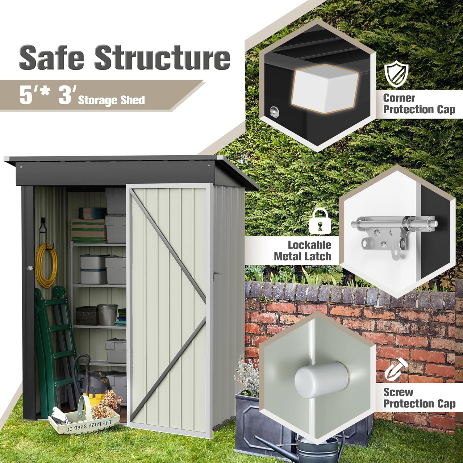 - User-friendly design: This lockable storage room is designed with plastic protective caps with pointed corners and sharp screws to prevent people from being injured during installation or use.