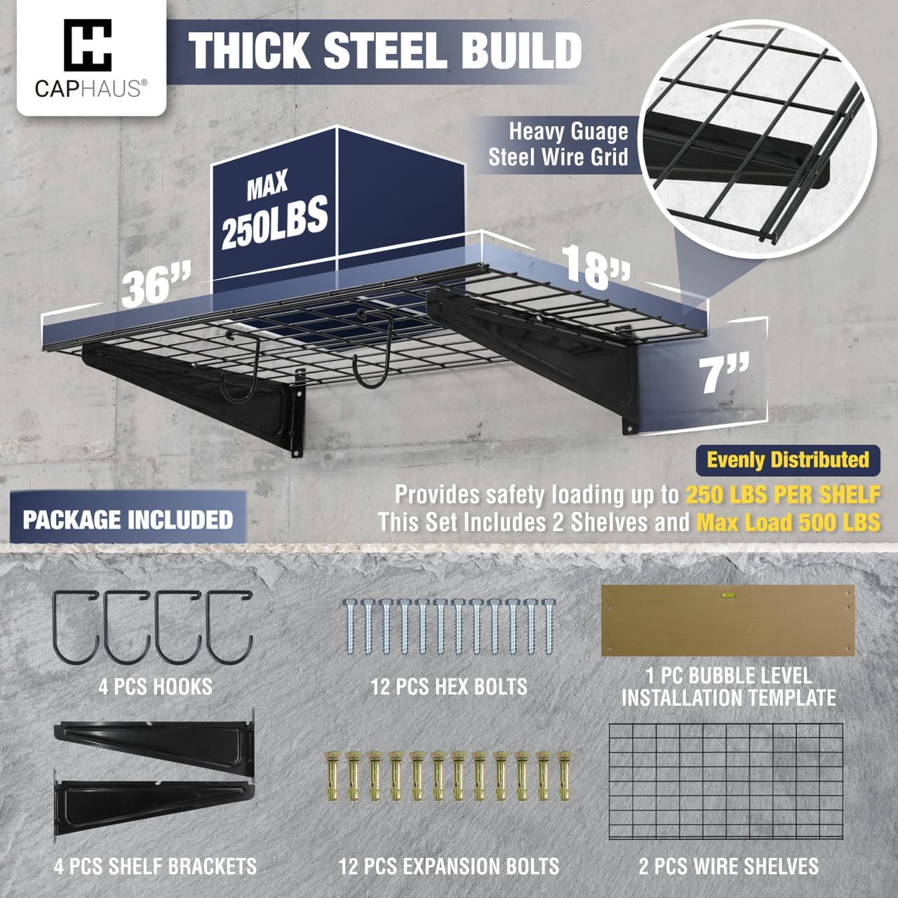- 🔨 Robust Steel Construction - Our garage wall shelving set includes wire shelving and wall brackets with a durable powder-coated finish, marrying a sleek look with sturdiness. The intelligent design of our steel storage rack allows overhead storage and accessory hook usage, maximizing garage space and organization. We provide high-quality screws that have undergone rigorous testing to ensure durability. Each hook included in the package has a weight capacity of 33 lbs.