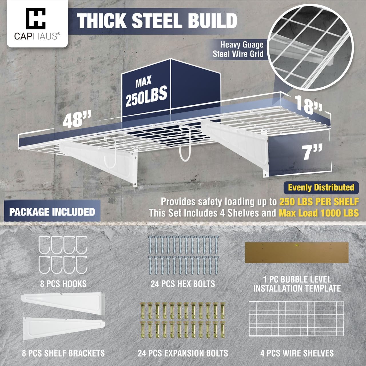 - 🔨 Robust Steel Construction - Our garage wall shelving set includes wire shelving and wall brackets with a durable powder-coated finish, marrying a sleek look with sturdiness. The intelligent design of our steel storage rack allows overhead storage and accessory hook usage, maximizing garage space and organization. We provide high-quality screws that have undergone rigorous testing to ensure durability. Each hook included in the package has a weight capacity of 33 lbs.