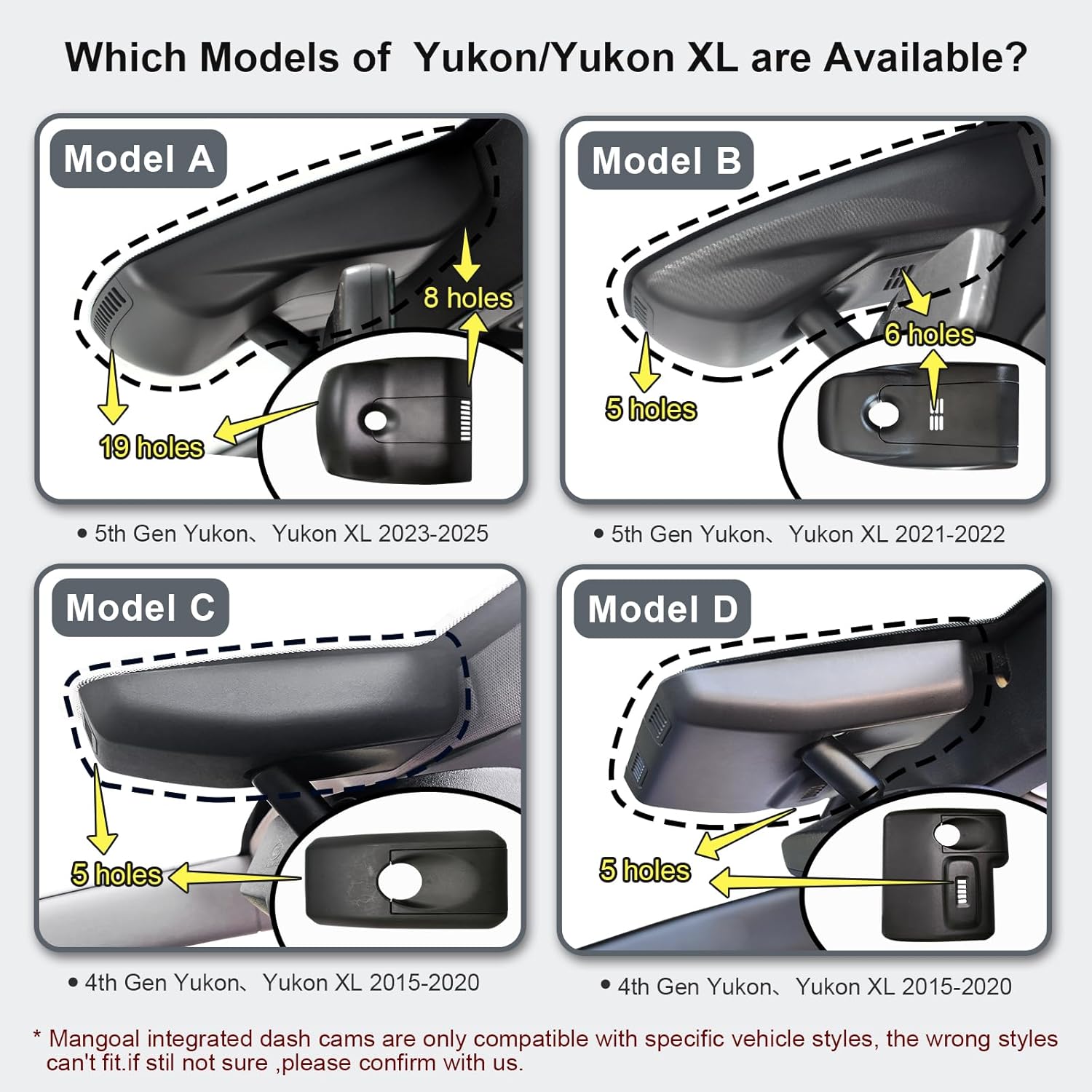 - ăCustom fit for GMC YukonăMangoal 4K and Rear 1080P dash cam can fit perfectly behind the rear view mirror like original. No messy wiring exposed, no complicated rewire at all. Perfectly intergrated with GMC Yukon, Yukon XL 2021-2022 vehicle styles. Such as SLE SLT AT4 Denali .