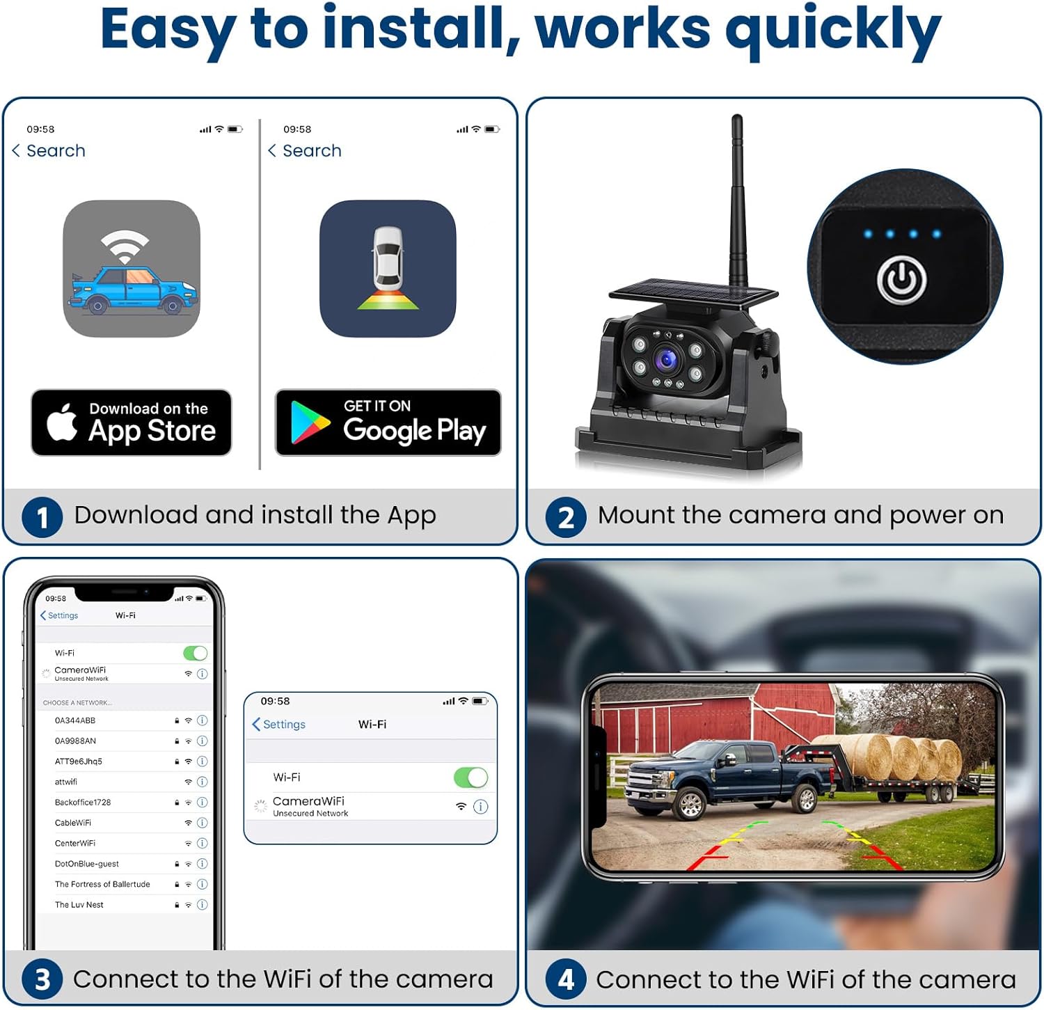- 【Solar Charge】WiFi backup camera wth built-in Type-C port, the camera can charged via Type-c Cable. Equipped with solar panels, the camera can replenish energy through solar energy