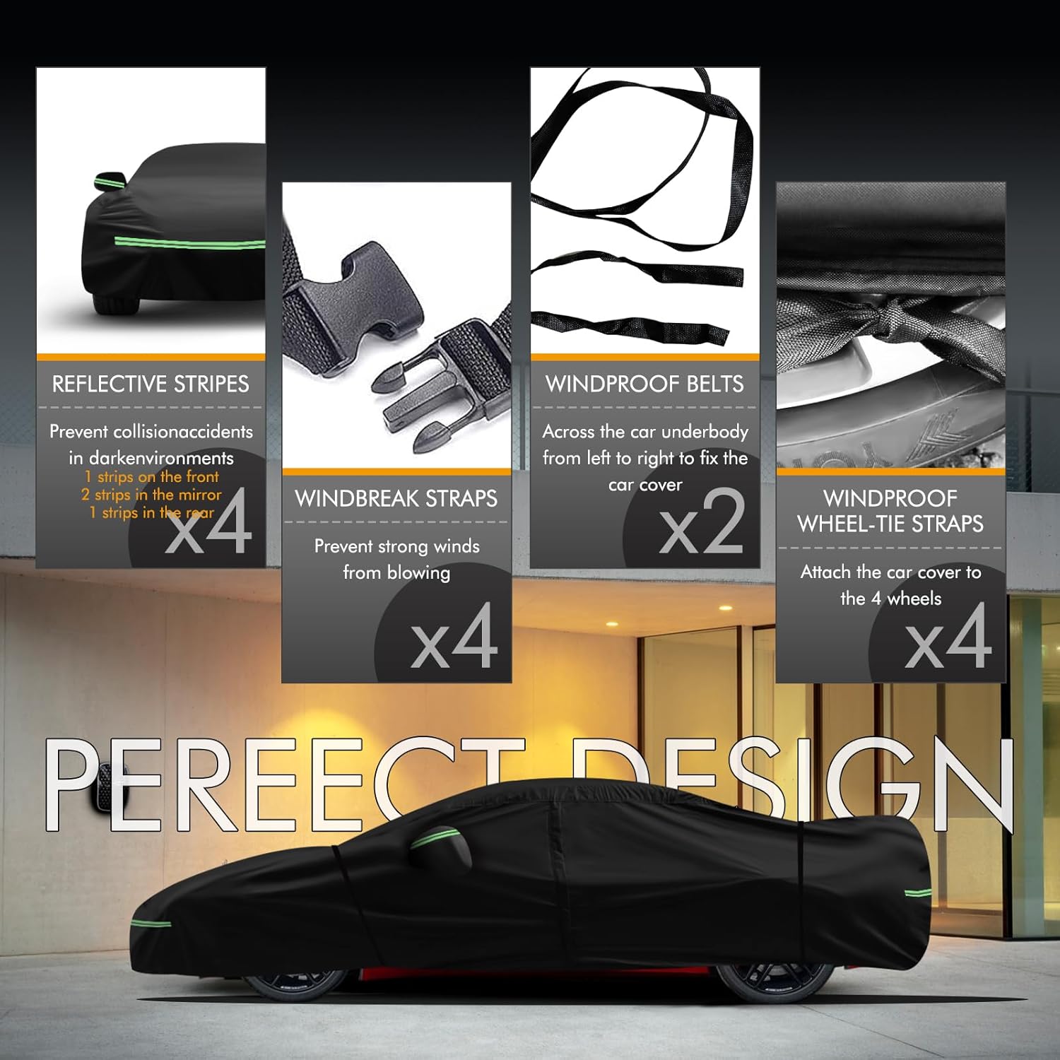 - ðãUpgrade Windproof Designãâ A windproof fixed buckle pass through the middle of the car for easy fixing; â¡Windproof belts at the front and rear; â¢4 straps to tie the cover to the four wheels; â£Elastic band at the bottom can easily adjust the size of the cover; â€Double stitching ensures that the cover will not tear easily, making it more durable; â¥The included safety latch secures the cover. Multiple upgraded designs keep your protective cover from being blown away even in strong winds.