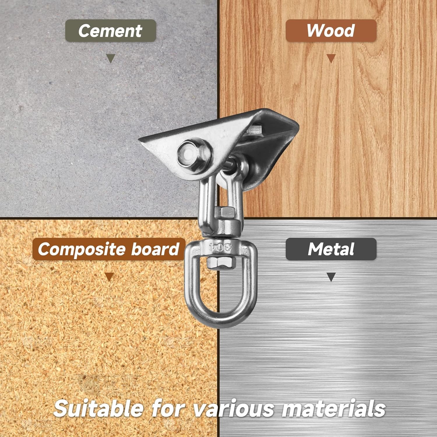 - Widely used in WOOD and CONCRETE : Our swing hardware provides 2 SCREWS for WOOD and 2 EXPANSION BOLT for CONCRETE, Perfect for Ceiling, Punching Bag, Porch Swing, Hammock, Swing Chair, Ring, Yoga Swing, Boxing Equipment, etc.