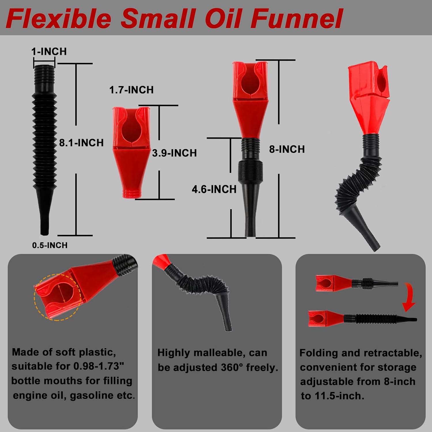 - Oil Filling Funnel: The oil funnel feature flexible, adjustable nozzles can be snap to 0.98-1.73" fuel bottles according to the user's specific size needs, can be easily clamped at the bottle mouth which fits for filling engine oil or gasoline or other fluids for car, truck etc.
