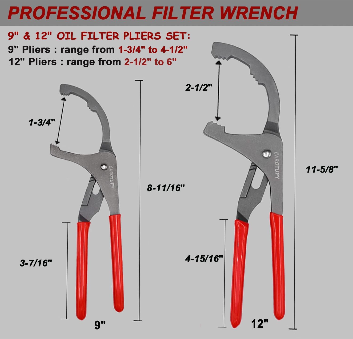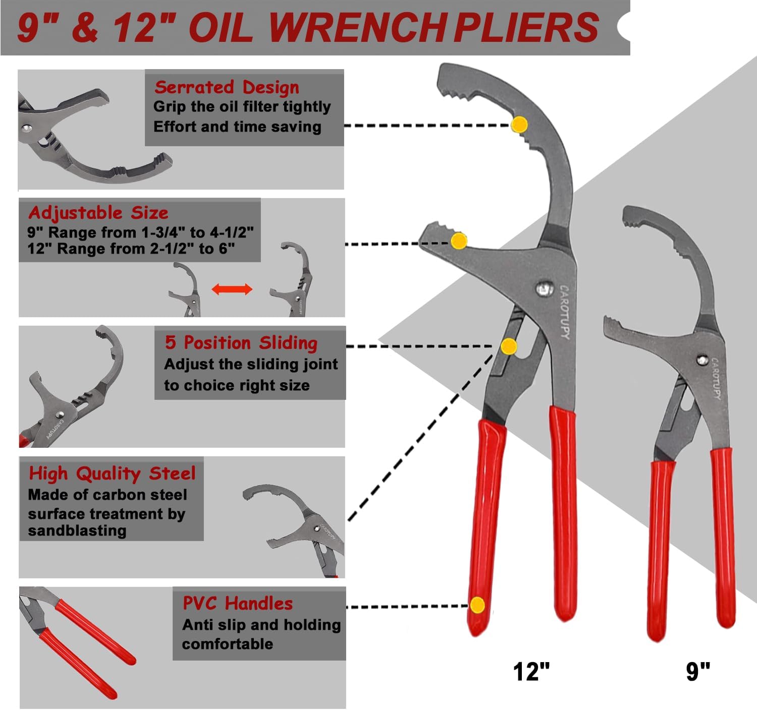 - Oil Filter Plier: The 9" and 12" oil filter removal tool adjustable from 1-3/4" to 6" designed with 5-position slip joints, with strong jaws and serrated teeth, can use for various dimensions of oil filters replacement for home use or repair shops.