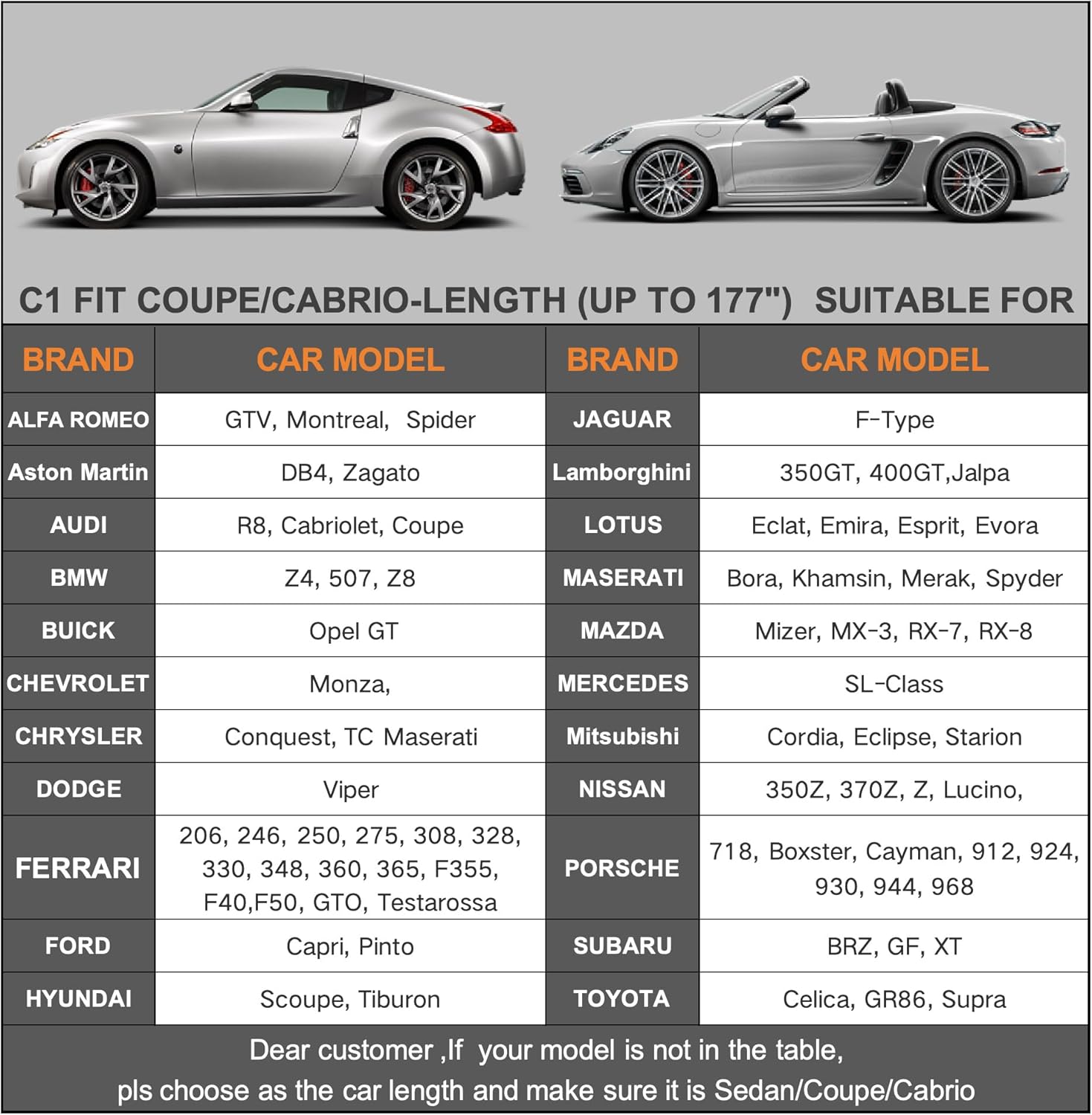 - ăDimension C1ăUniversal fit for sedan/Coupe/Cabrio which length is 177 inch (Not for hatchback and SUV). Suitable Nissan Versa/350Z/370Z, Porsche 718 Cayman, Dodge Viper etc.