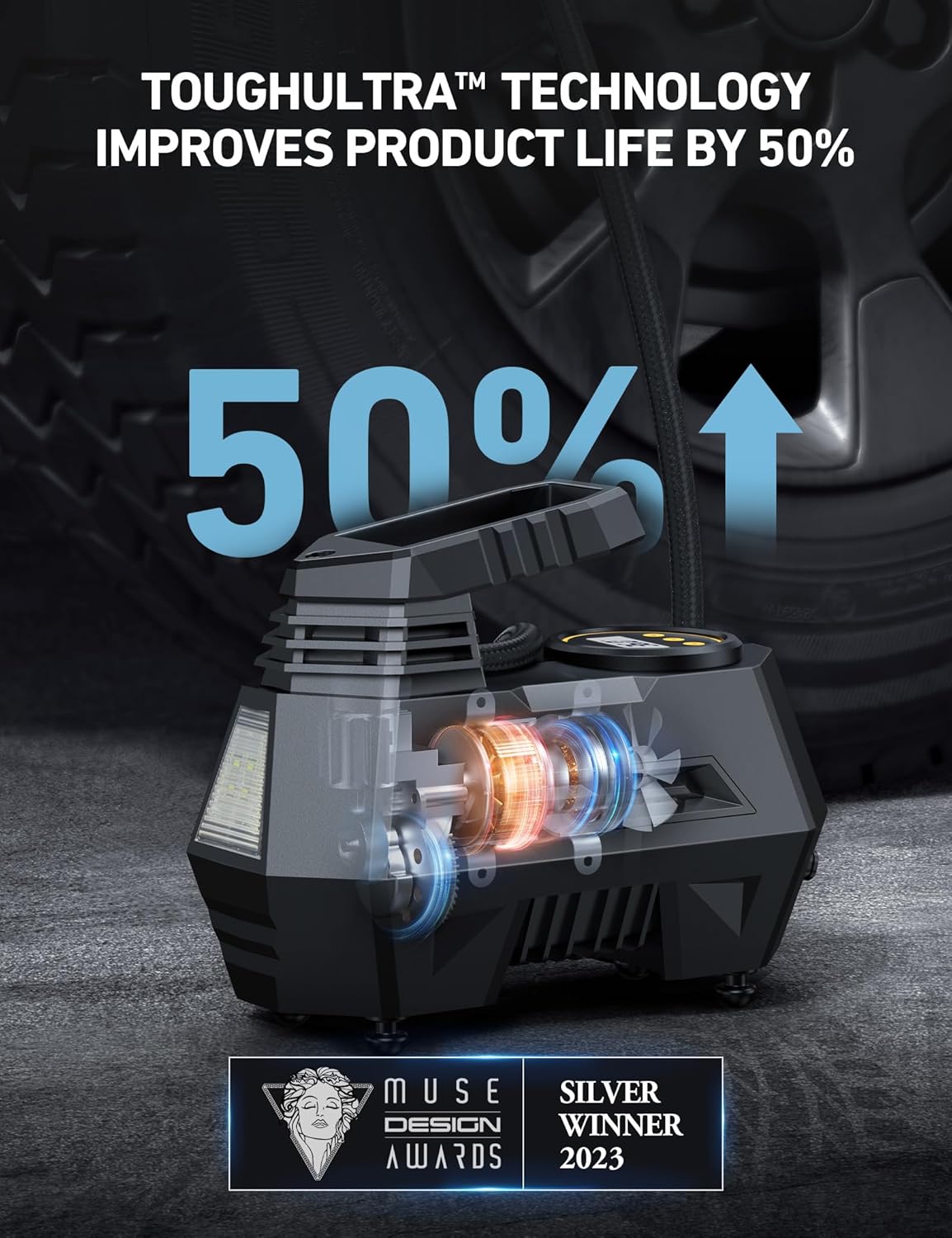 - TOUGHULTRA TECHNOLOGY, ENHANCED DURABILITY: This tire inflator is manufactured with AstroAIās unique ToughUltra technology, so all of its core parts, including its cylinder, motor gears, and connection rod, are built using a powder metallurgy integrated molding technique. This revolutionary manufacturing process greatly enhances the inflatorās durability and increases its service life by 50%.
