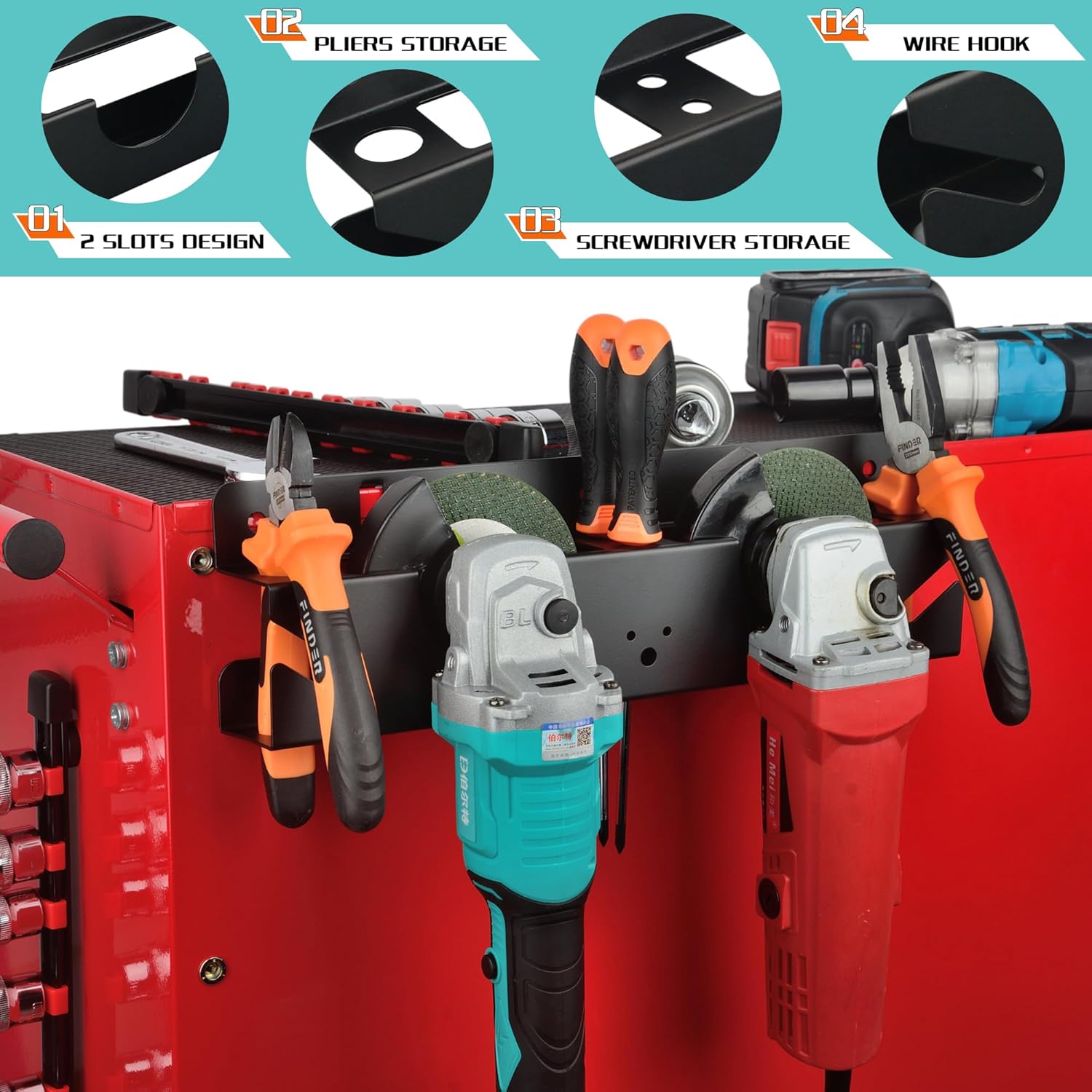- [Utility Storage Tool Rack]: Our utility storage rack is perfect for organizing angle grinders, polishers.Can be mounted on tool carts, workbench sides, pegboard or garage walls