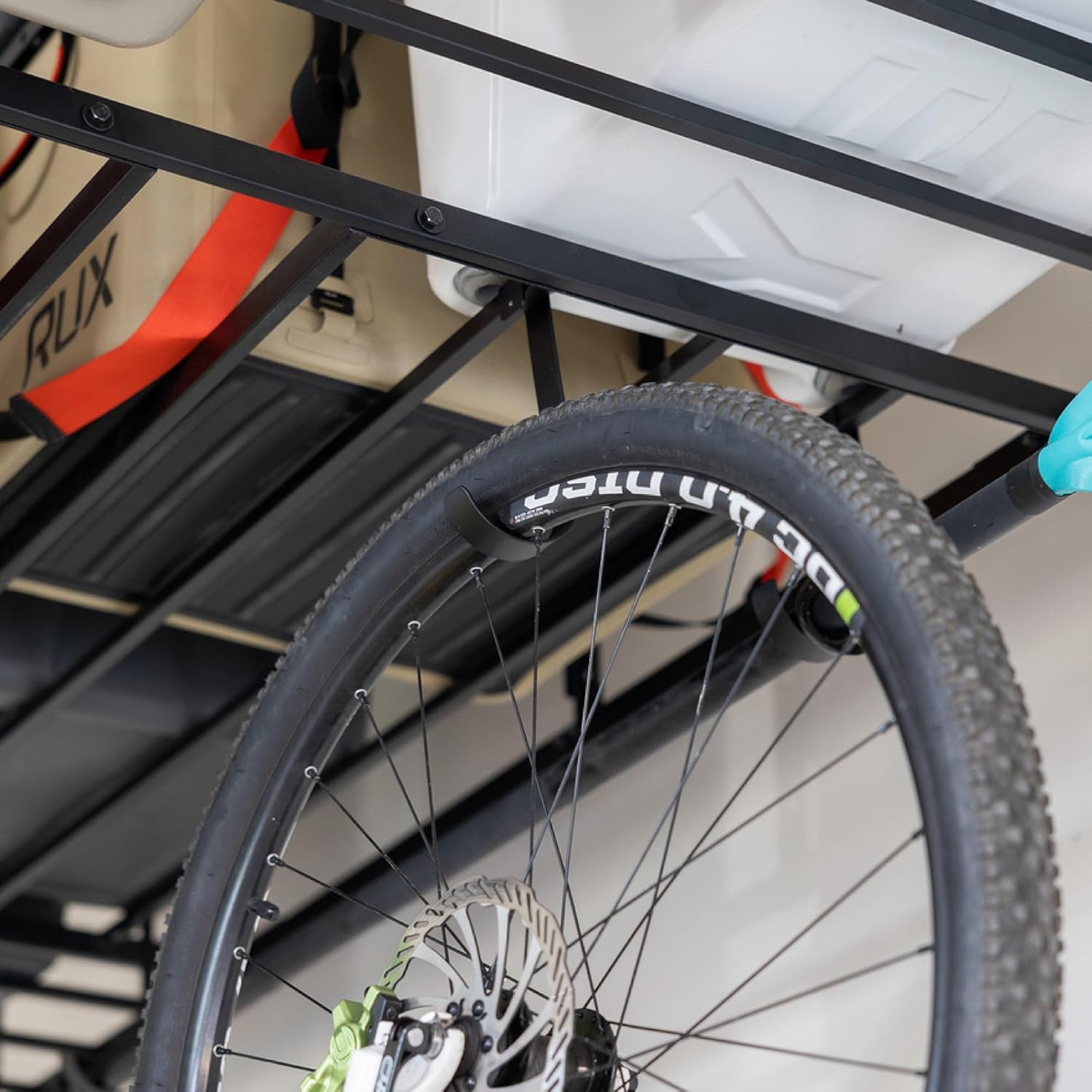 - 6 Hanging Storage Hooks: The overhead storage system includes 6 hooks that attach below the shelf to hold bikes, extension cords, bags, paddles, garden hoses, tools, and more. Make the most of your garage storage with hanging ceiling storage.