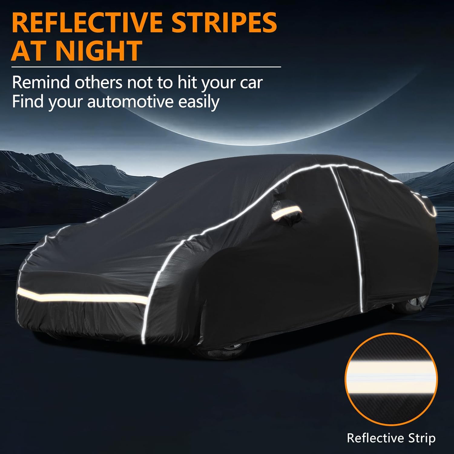- Thoughtful Design: Our car covers have a driver door zipper for easy access. And the cover with four wind stripes can completely cover and stick to the car body to avoid being easily blown away by the wind. Then the reflective strips provide night visibility, and your car's contour can be easily seen and avoid accidents