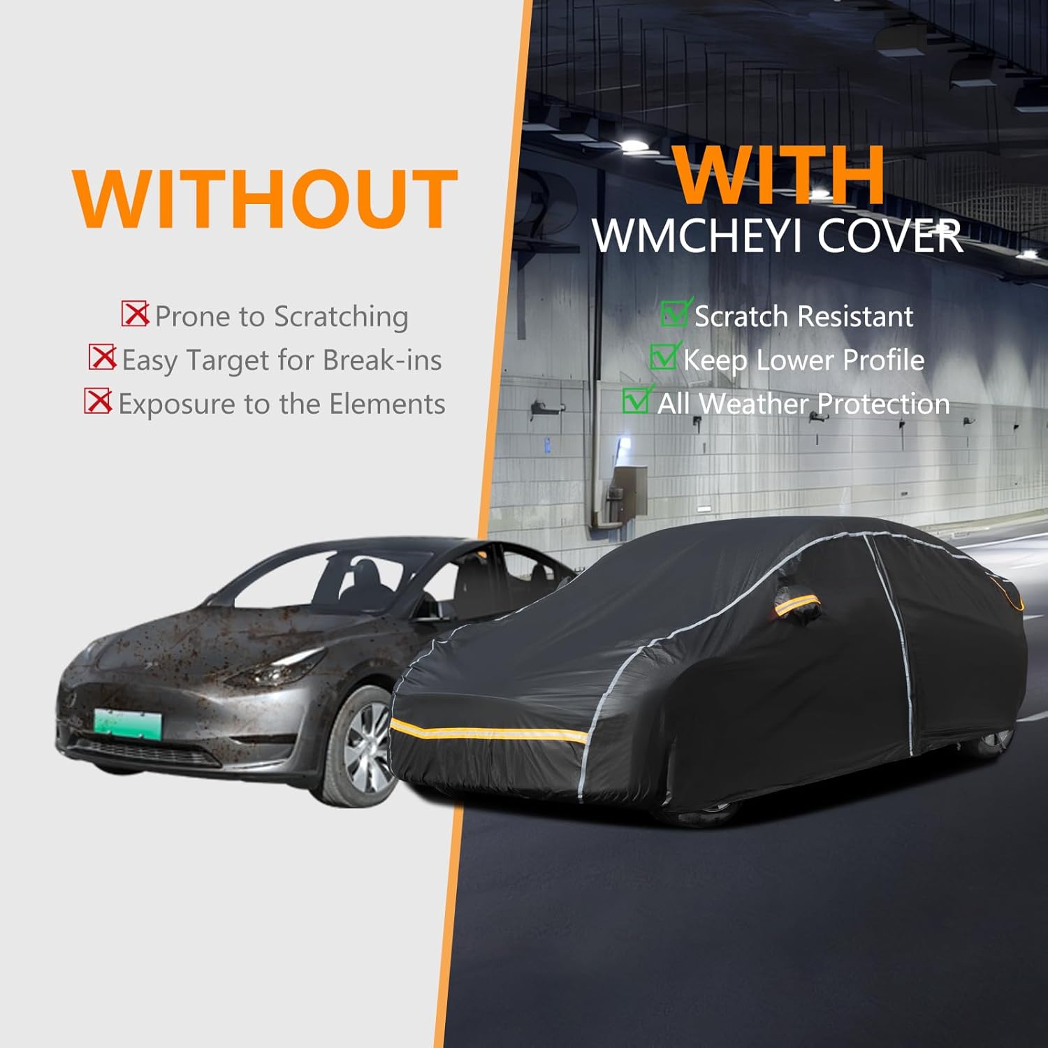 - Premium Material: WMCHEYI car cover is made of 6 layers of heavy-duty premium quality material, including non-woven fabric, PE, EVA, and soft lining. Features breathable, durable, and water resistant with a dual outer shell that provides UV protection. And the reinforced seams breathability - Front and rear elastic hems drawstrings - to ensure fit