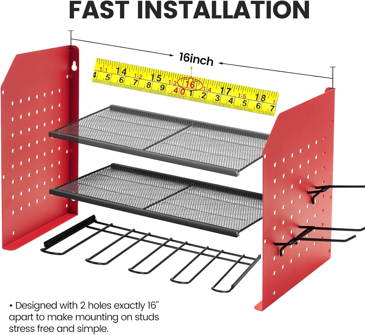 - Versatile Side Pegboards: Size 12"H×8.9"D, hang garage tools on pegboards with 4 included hooks, supports 0.25" pegboard accessories for DIY customization to increase storage space, improves load capacity and stability of the power tool rack