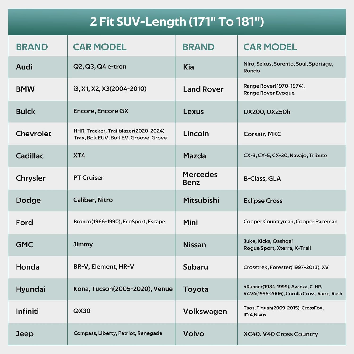 - ăCHOOSE THE RIGHT MODELă: Molebt car cover fits SUV/Jeep Length: 171"-181". For example Ford Escape, Subaru CrossTrek/XV/Forester, Hyundai Tucson, Honda Element/HRV, Kia Soul/Sportage, Jeep Renegade, Lincoln MKC, Buick Encore, Mazda CX-30, Infiniti QX30, Toyota CHR etc.
