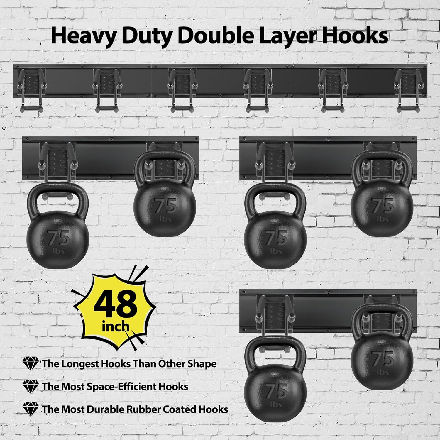 - HEAVY DUTY WALL STORAGE SYSTEM: Our garden tool storage rack boasts heavy-duty construction, crafted from solid steel with a durable powder-coated finish to prevent rust and ensure a lifetime of use. Each double UP-DOWM hook is rubber-coated, providing added protection against slippage and damage to your valuable tools.