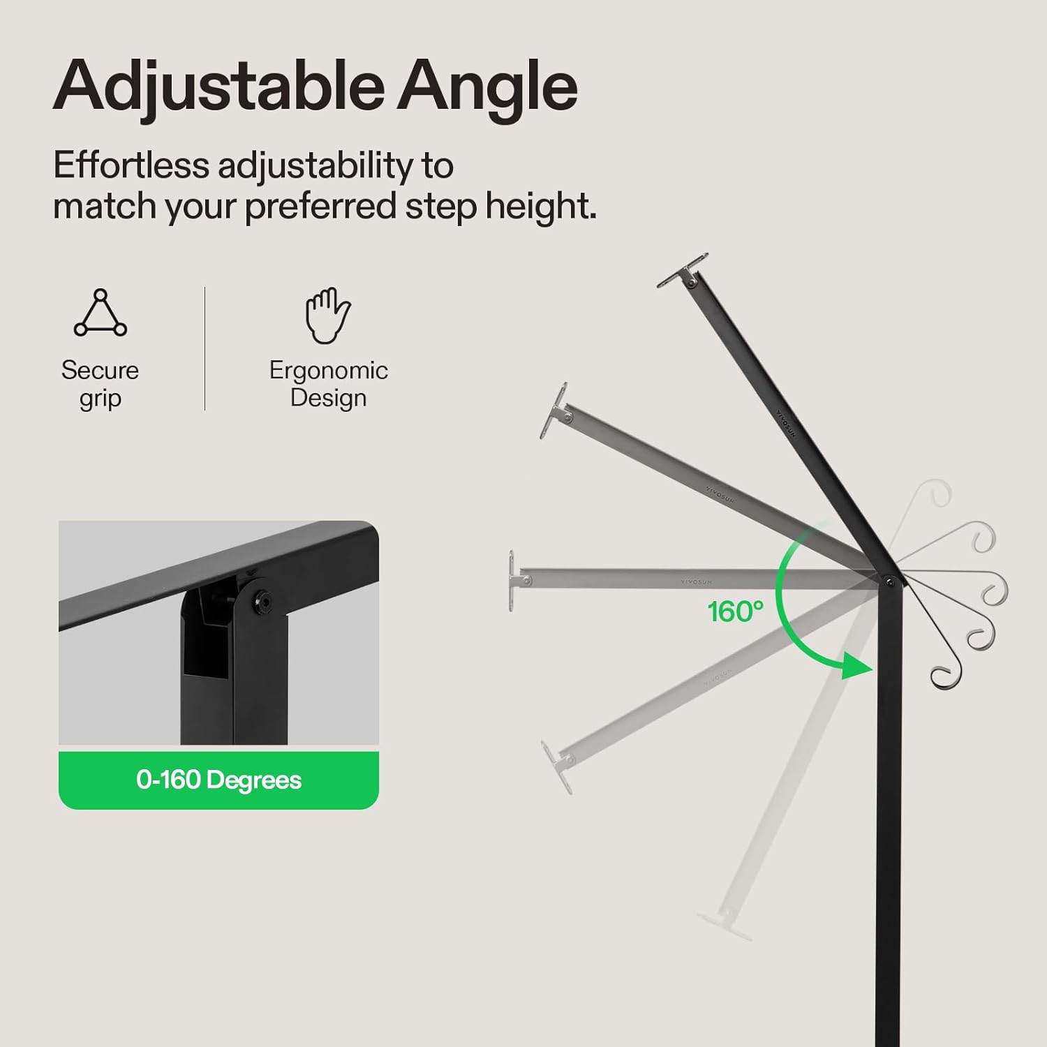 - Adjustable & Flexible: This stair railing offers effortless adjustability to match your preferred step height; Angle adjustment spans from 0 to 160 degrees, accommodating various height requirements; Not only suitable for 1 to 2 vertical steps, but also suitable for use on horizontal surfaces