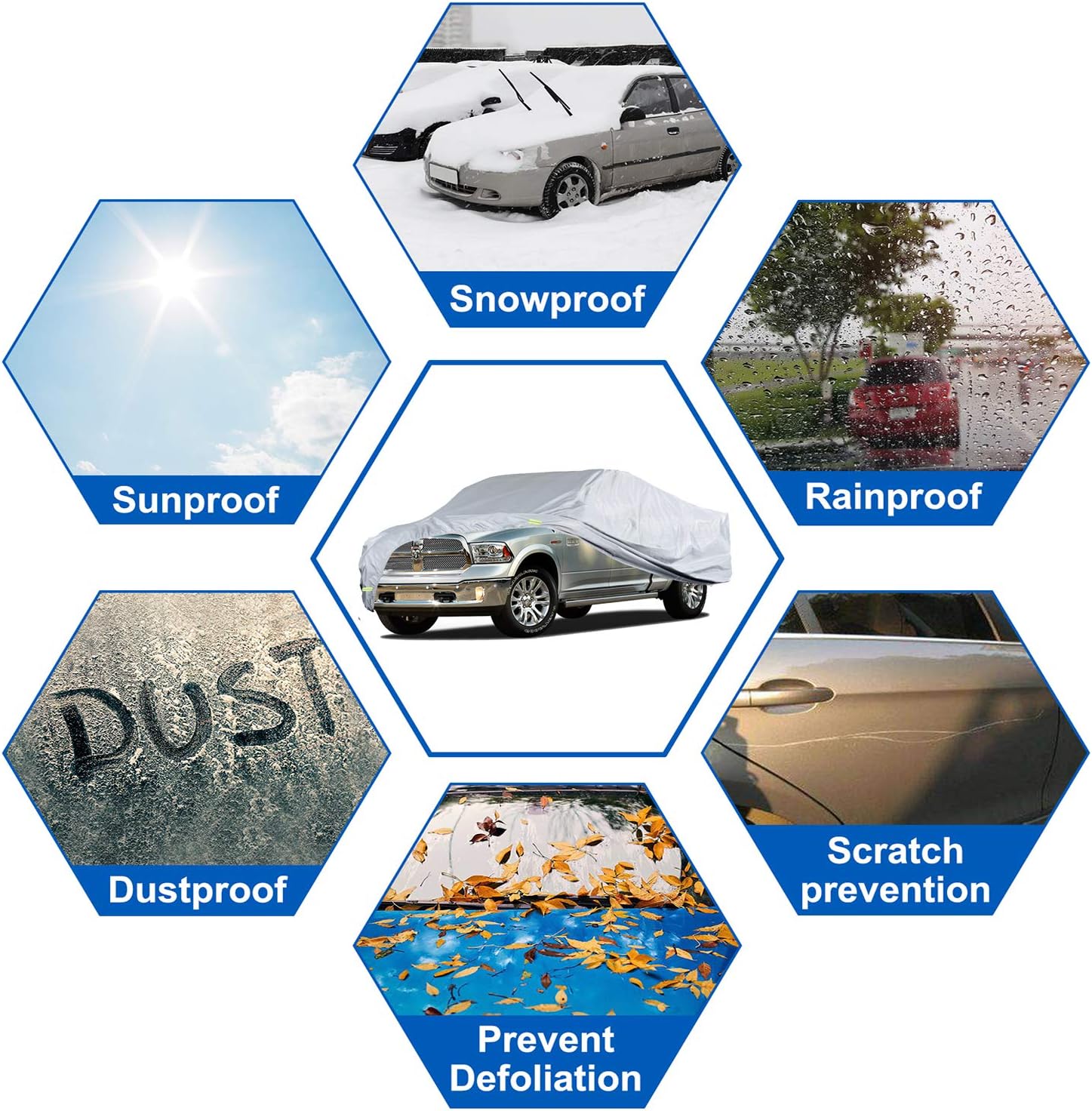 - ăupgrade materială--1. Using the latest KouKou multilayer heavy and safe material, full exterior covers has a very high resistance to impact and abrasion resistance, 100% waterproof. 2. Silver appearance has the advantages of good heat preservation and UV protection. Keep the car cool in the summer. 3. The lining material is very soft and the friction coefficient is very low to protect your car paint. koukou multi-layer material is much thicker and more durable than other similar products.