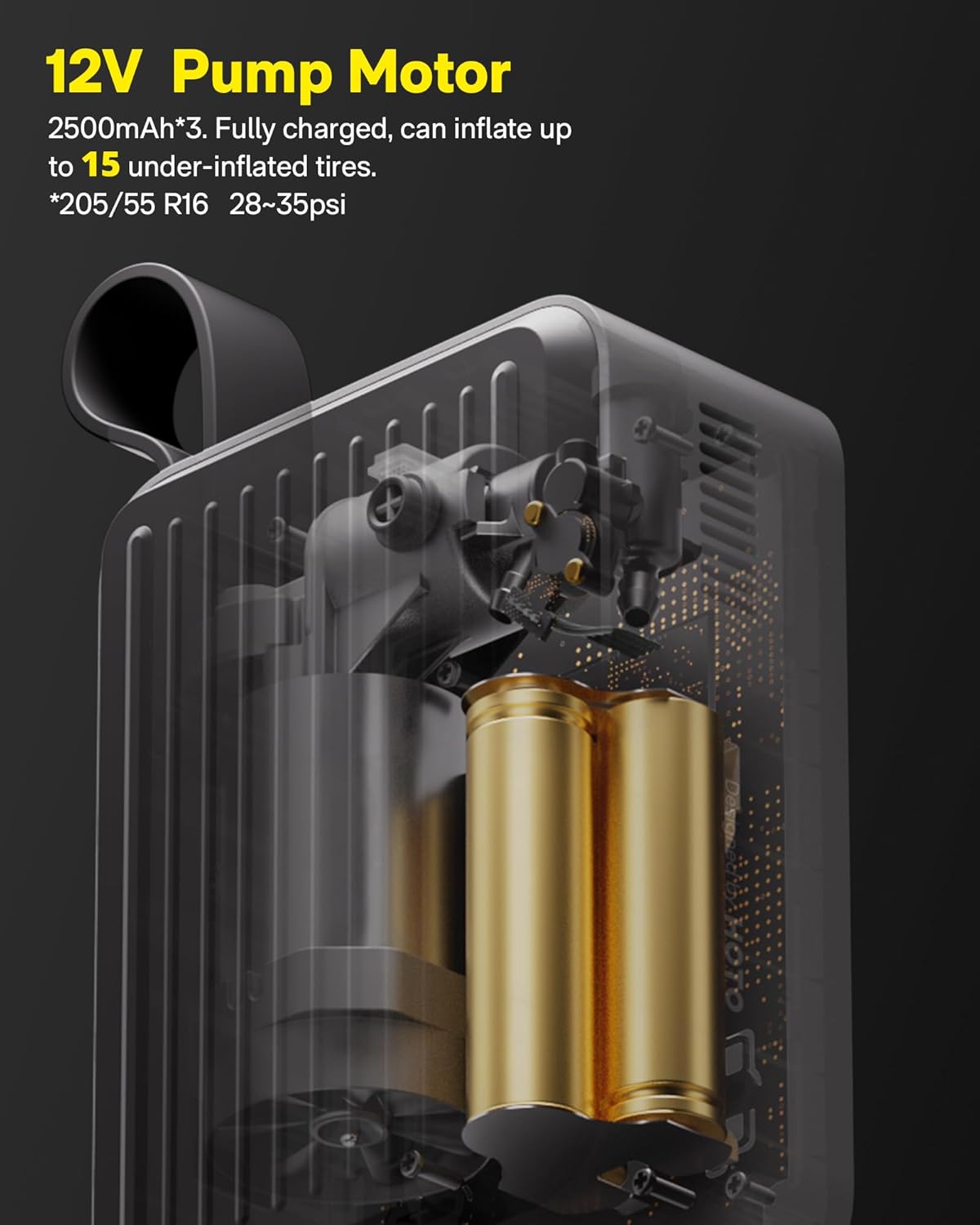 - ENHANCED BATTERY LIFE: Internal array of 2500 mAh*3 super large capacity lithium batteries and 12V pump motor, the upgraded HOTO tire inflator provides powerful and endurance capability. After fully charged, it can continuously inflate fifteen tires from 28~35 psi( tire specification: 205/55 R16)! Say goodbye to unexpected tire deflation and enjoy a seamless journey to your destination. NOTE: NO WORKING WHILE CHARGING. LEAVING MACHINE UNCHARGED FOR LONG TIME WOULD CAUSE MALFUNCTION