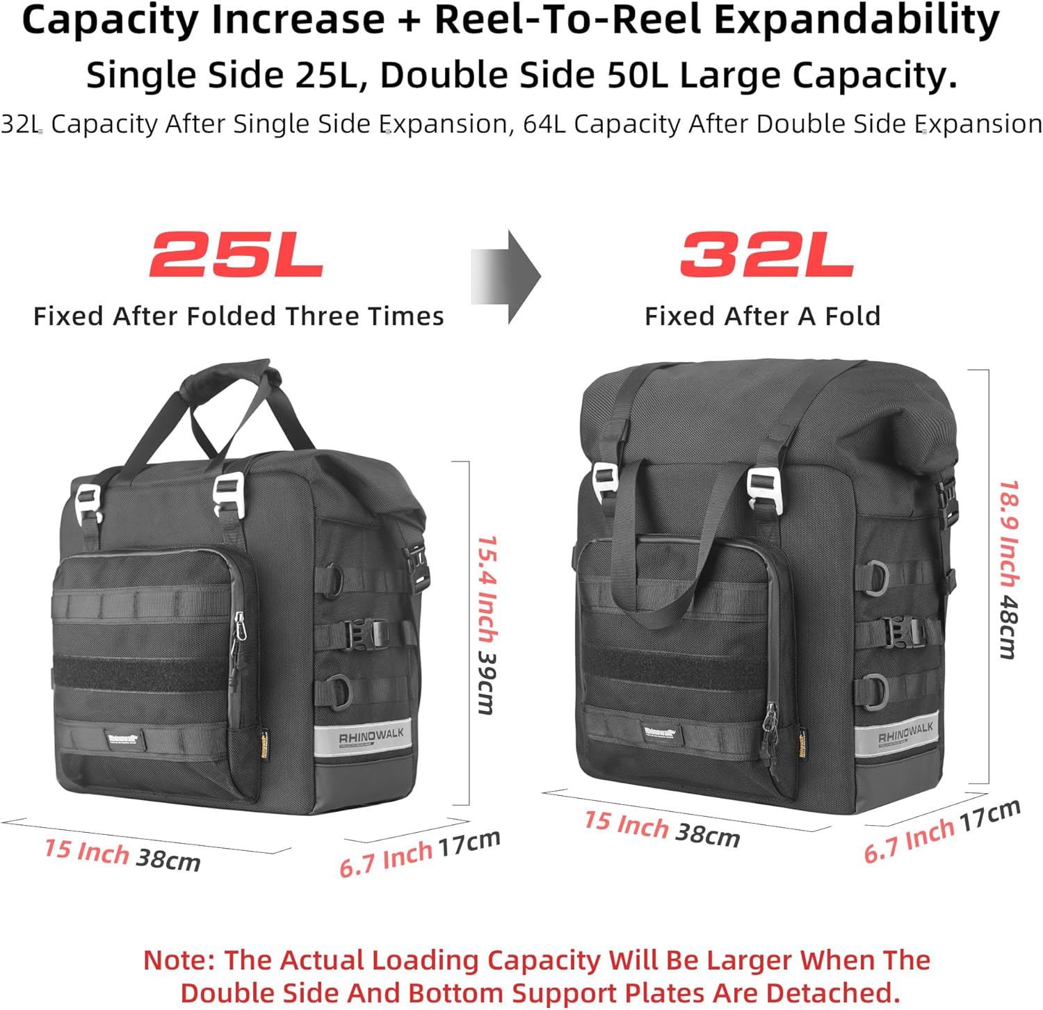 - 【LARGE CAPACITY】Single side bag folds 3 times to 25L, double side bag is 50L.