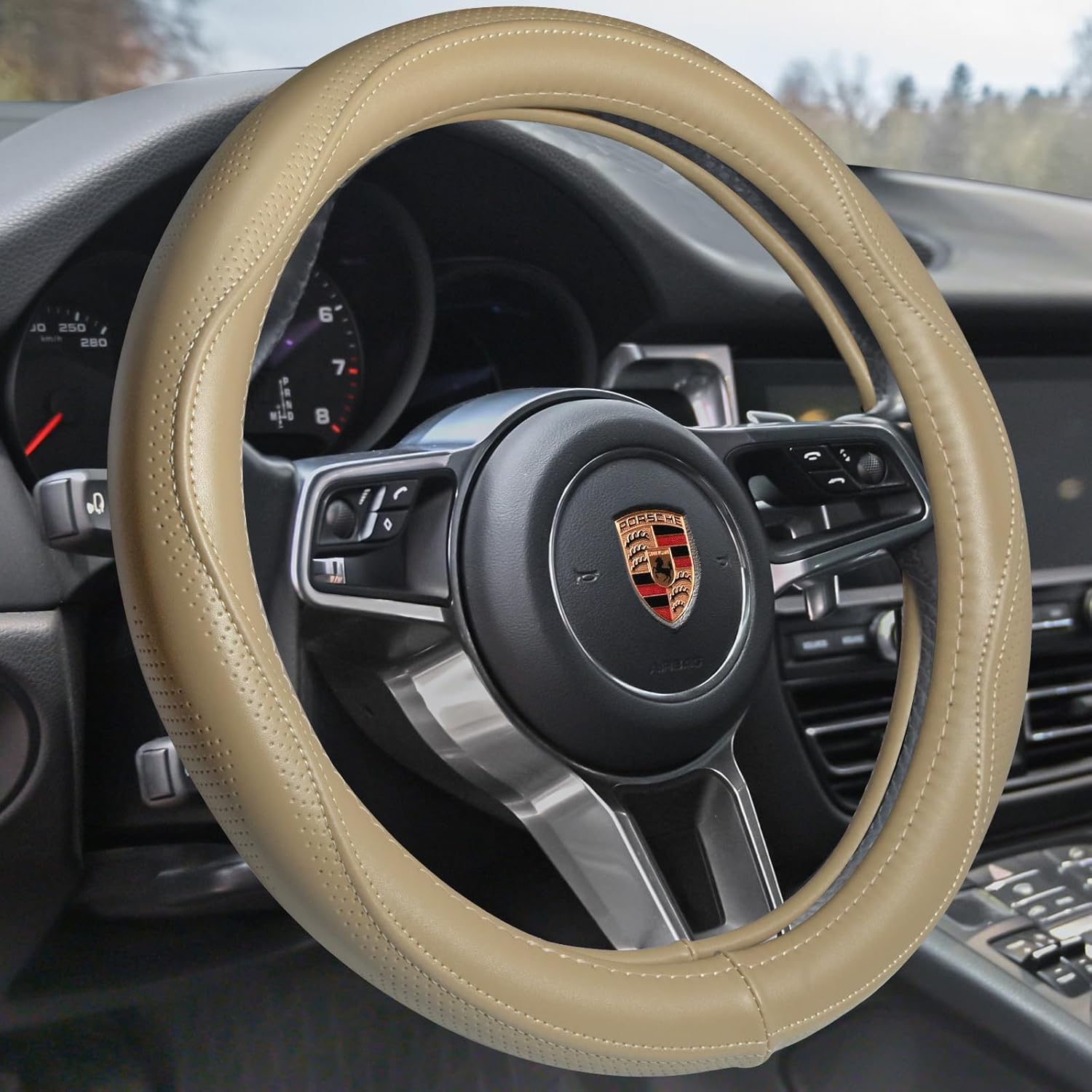 - SOFT & COMFORTABLE TOUCH: Using a real leather streeing wheel cover to help absorb hand pressure from the steering wheel. It’s soft and durable with a breathable touch.
