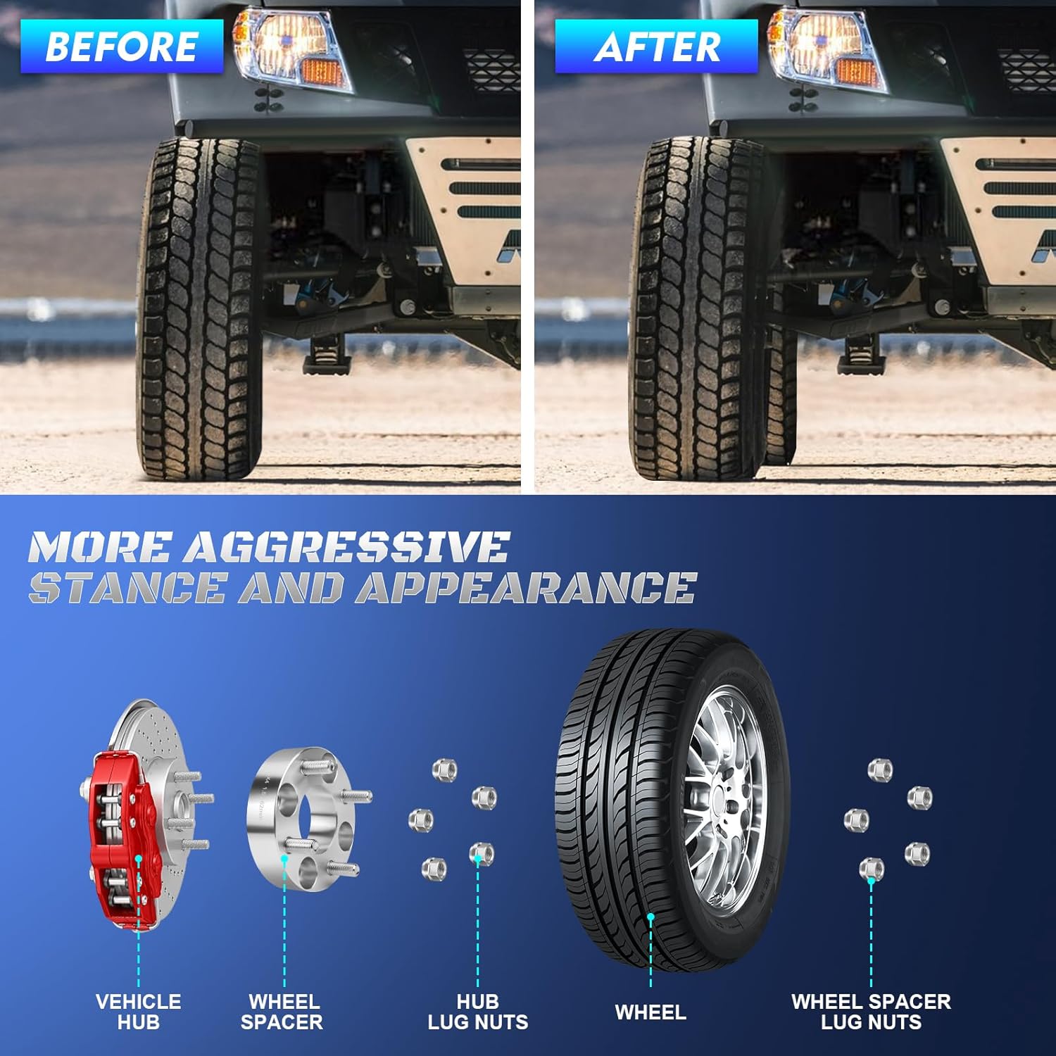 - Spacer Features: Provide additional clearance between the wheel and hub assembly, thereby improving the vehicle's performance in terms of handling and traction. It will make your vehicle more stable and allow installation of lift/lowering kits and larger traction tires.