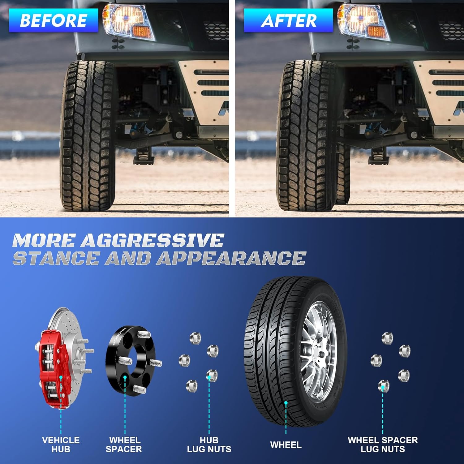 - ✔ Spacer Features: Provide additional clearance between the wheel and hub assembly, thereby improving the vehicle's performance in terms of handling and traction. It will make your vehicle more stable and allow installation of lift/lowering kits and larger traction tires.
