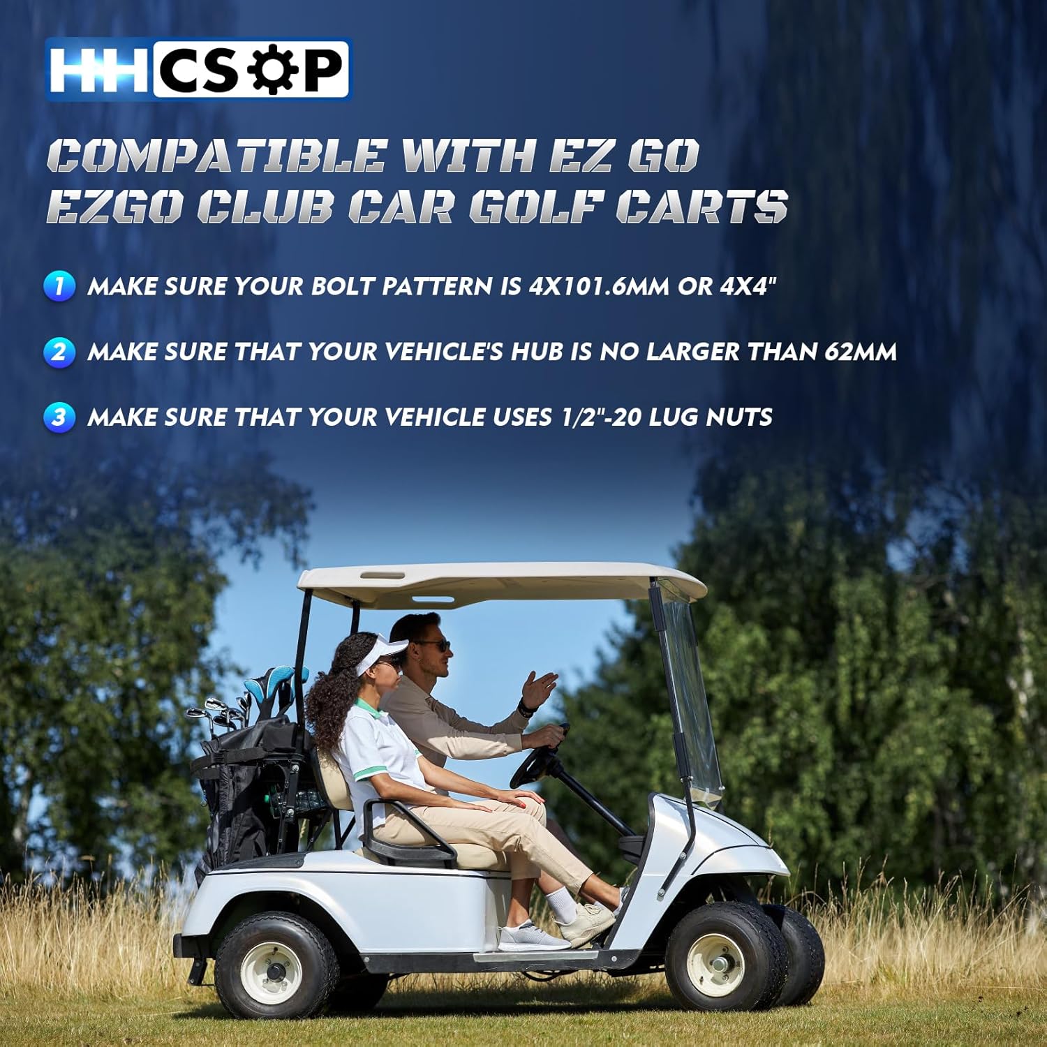 - ✔ Vehicles Fitment: Compatible with many 4x4", 4x101.6, 4x100 Bolt Pattern EZ GO EZGO Club Car Golf Carts and ATV vehicles. (Vehicle hub studs and lug nuts must be with 1/2"-20 1/2x20 1/2"x20 thread pitch)