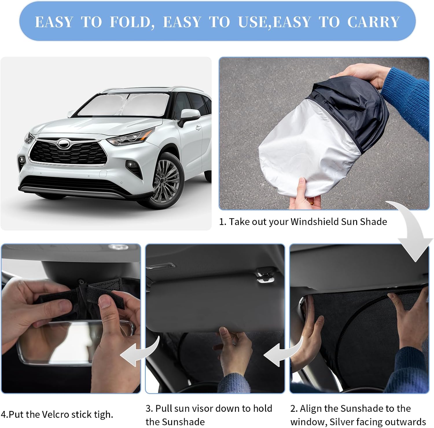 - 【Vehicle Specific 】Sunshade windshield Custom for Toyota Highlander 2026 2025 2020 2021 2022 2023 2024 ( L LE XLE Limited Platinum ) --You've spent too much time in the California and Texas sun, buy it now, Please don’t waste time,reject the heat, quality products - Collapsible sun shade can be full covered on windshield and No gap. Fits like a charm!