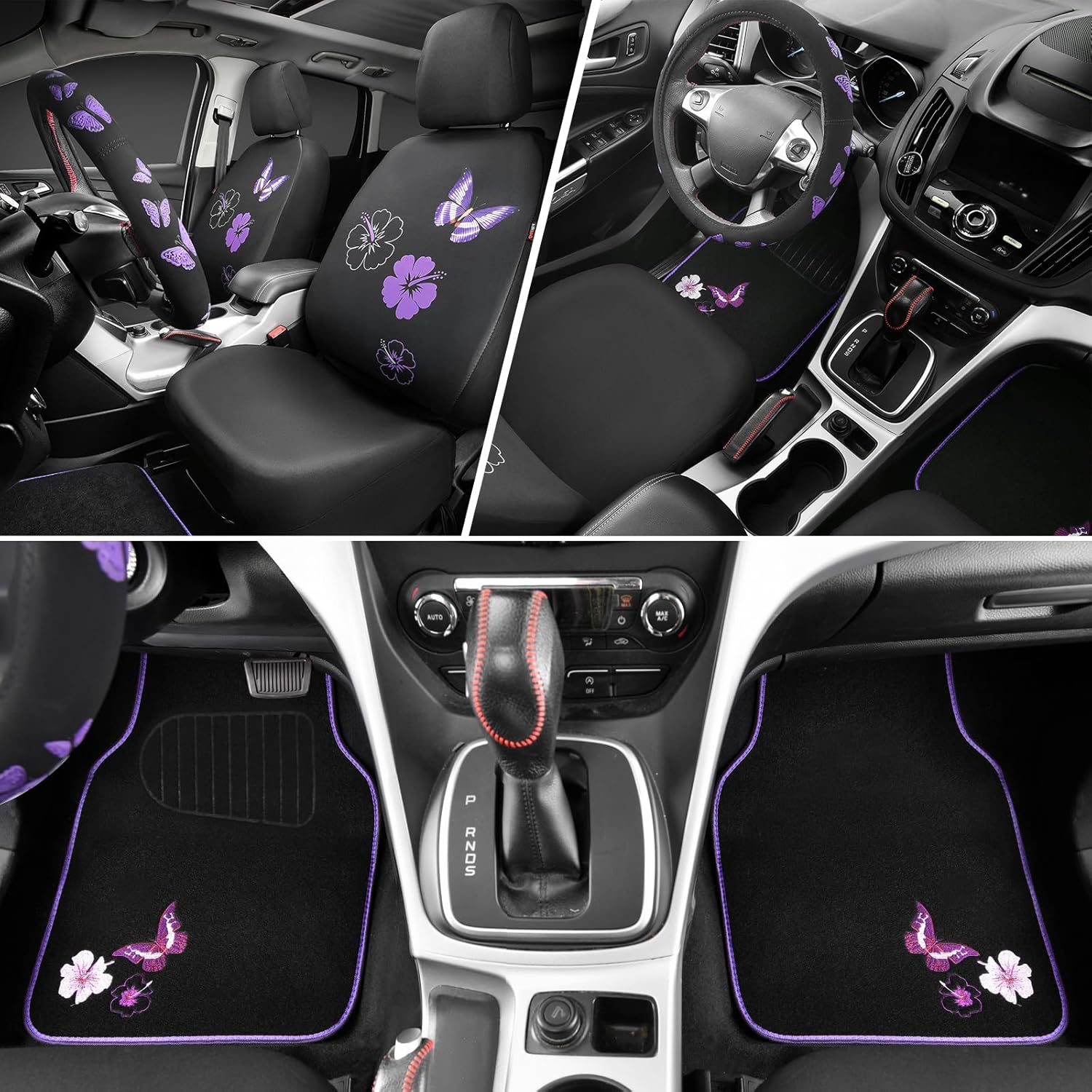 CAR PASS Universal Butterfly Car Seat Covers Front Set, Embroidered Flower Waterproof Car Floor Mats Carpet, Butterflies Steering Wheel Cover for Car Accessories Interior Sets (Black and Purple)