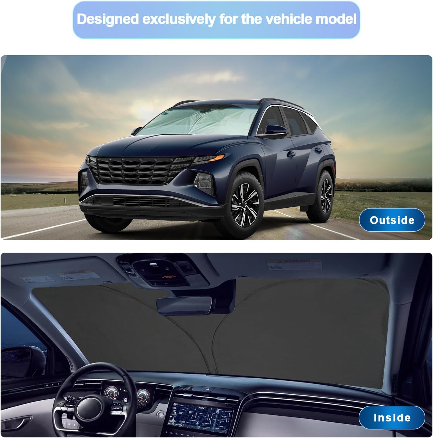 - 1.Custom Fit: this windshield sun shade is custom designed for 2022 2023 2024 2025 Hyundai Tucson Santa Cruz sunshade for 2022 2023 2024 2025 Hyundai Tucson Santa Cruz Limited SE SEL XRT NIGHT accessories front window.You donât need to worry about oversize or too small,consider it if you need a car protector cover that protects your car interior from sunburn.