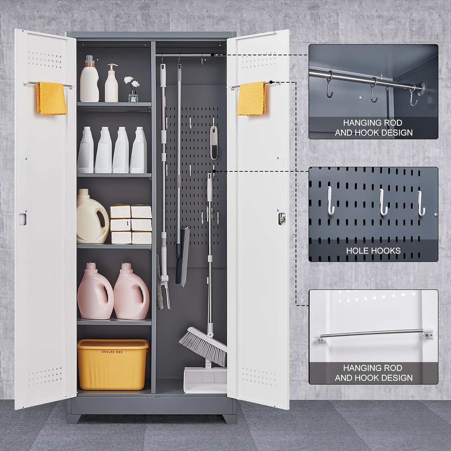GREATMEET 72.8" Broom Storage Cabinet, Utility Cabinets for Brooms and Mops, Metal Storage Cabinets for Cleaning Supplies, Utility Closet for Garage, Grey&White