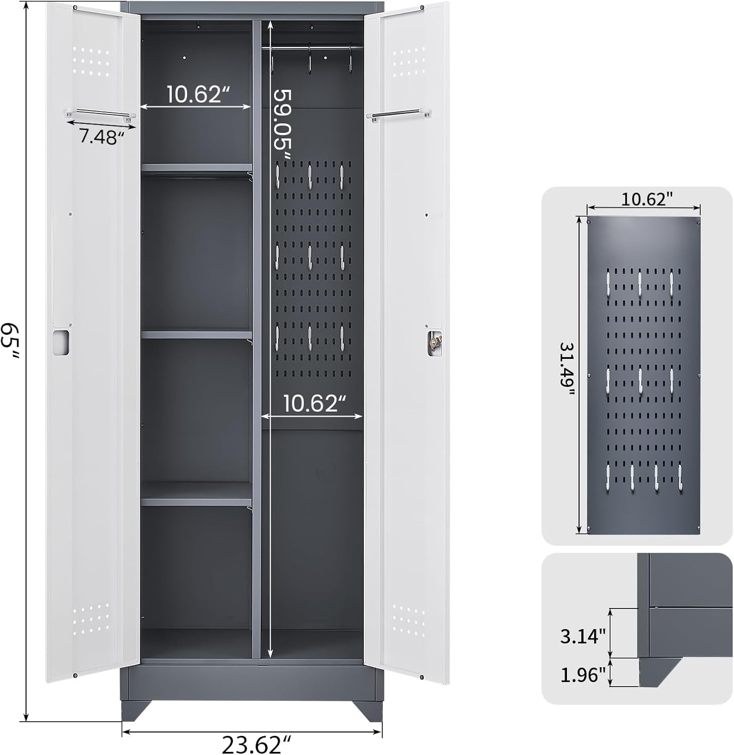 - ăBroom ClosetăDimensions: 15.75"D x 23.62"W x 65"H. This metal garage storage cabinet is made of pure steel material with a powder-coated surface, which is waterproof and easy to clean, ensuring long-term use. The perforated panel design prevents moisture and allows for breathability.