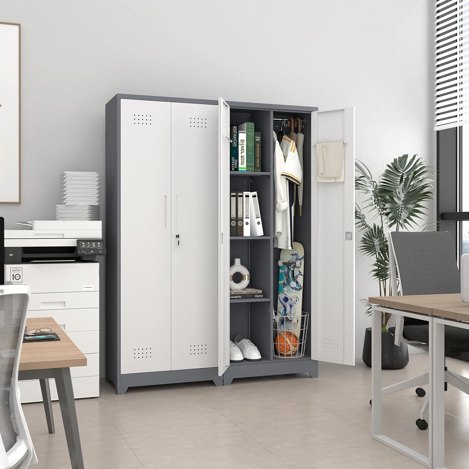 - ăVersatile UseăThis cleaning metal storage cabinet comes with multiple accessories to meet your needs. Adjustable shelves accommodate items of varying heights. The right side is equipped with a hanging rod and S-hooks, and the hanging rod on the door can be used for towels and other items. The perforated panel design makes it easy to store and retrieve tools, keeping the space tidy and organized. The cabinet can store documents, brooms, mops, tools, towels, clothes, and more.
