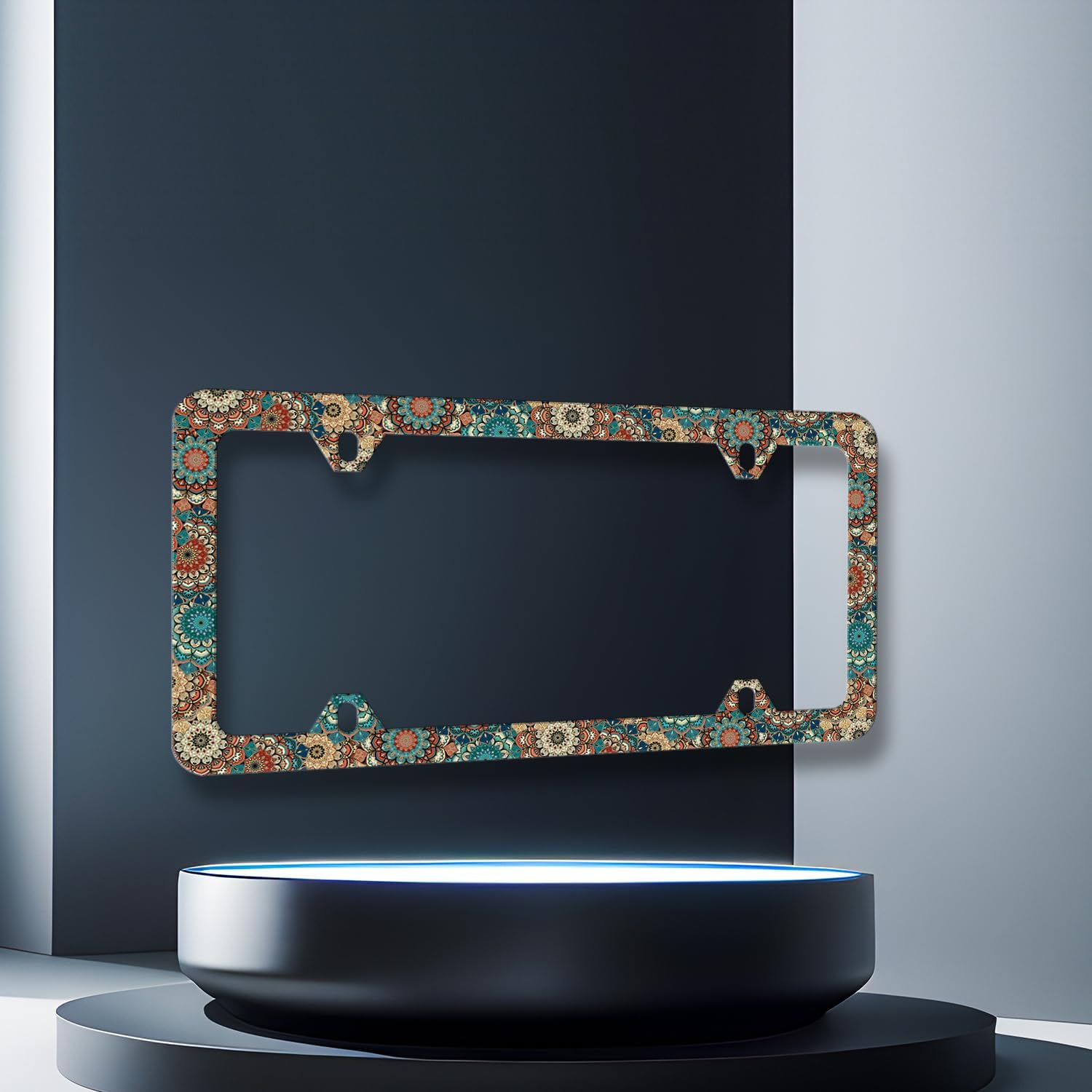 Vintage Mandala Flowers License Plate Frame Boho Floral License Plate Holder Funny License Plate for Car Decoration Stainless Steel Colorful Car Accessory with Screws Men Women 12.3" x 6.3"