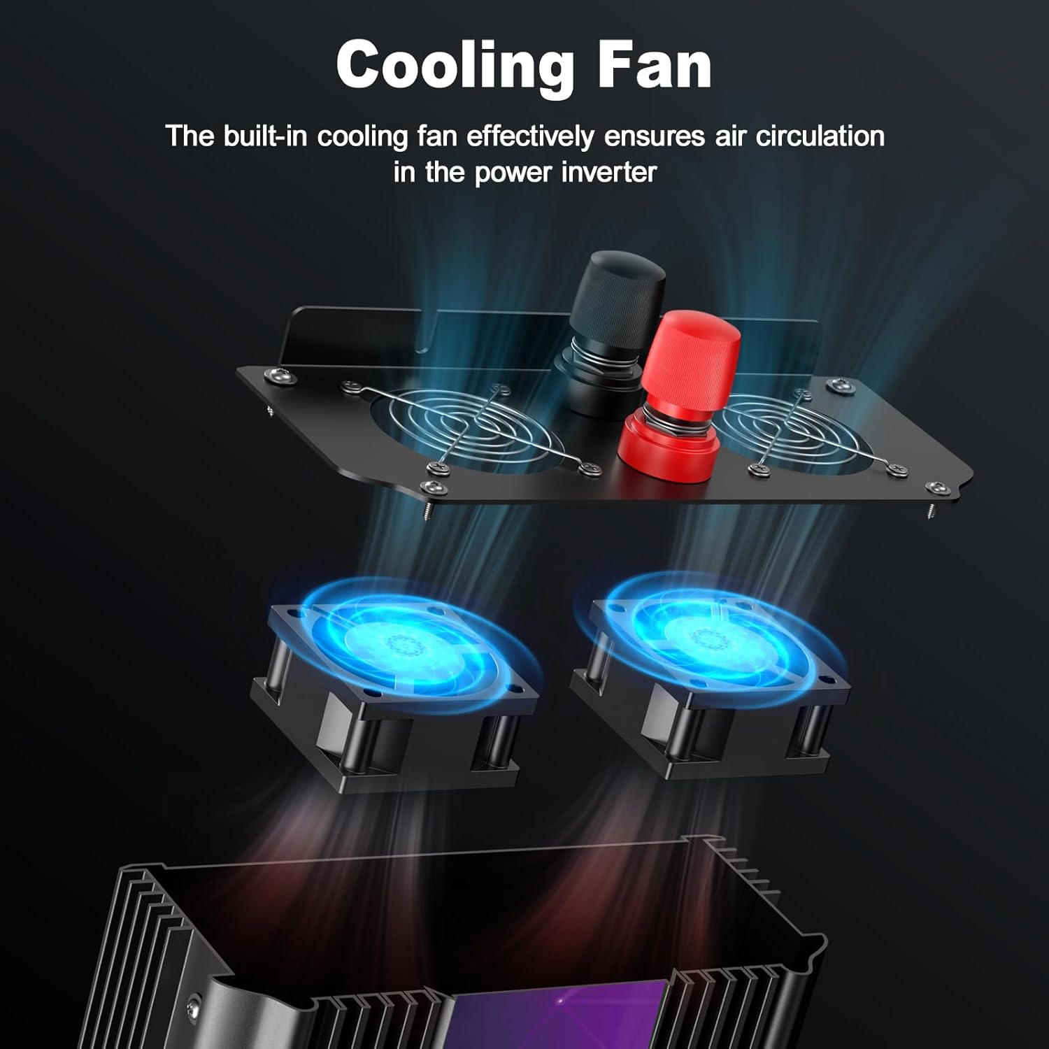 - ă5 Fold Comprehensive Safety ProtectionăOver Voltage / Low Voltage / Overload / Short Circuit / Over Heat.With advanced isolation drive technology.Durable Aluminum Housing can protect inverter from drops and bumps.The built-in cooling fan ensures you a ultra silent using experience,also keeps the inverter running safely and effectively at a low temperature to avoid overheat.