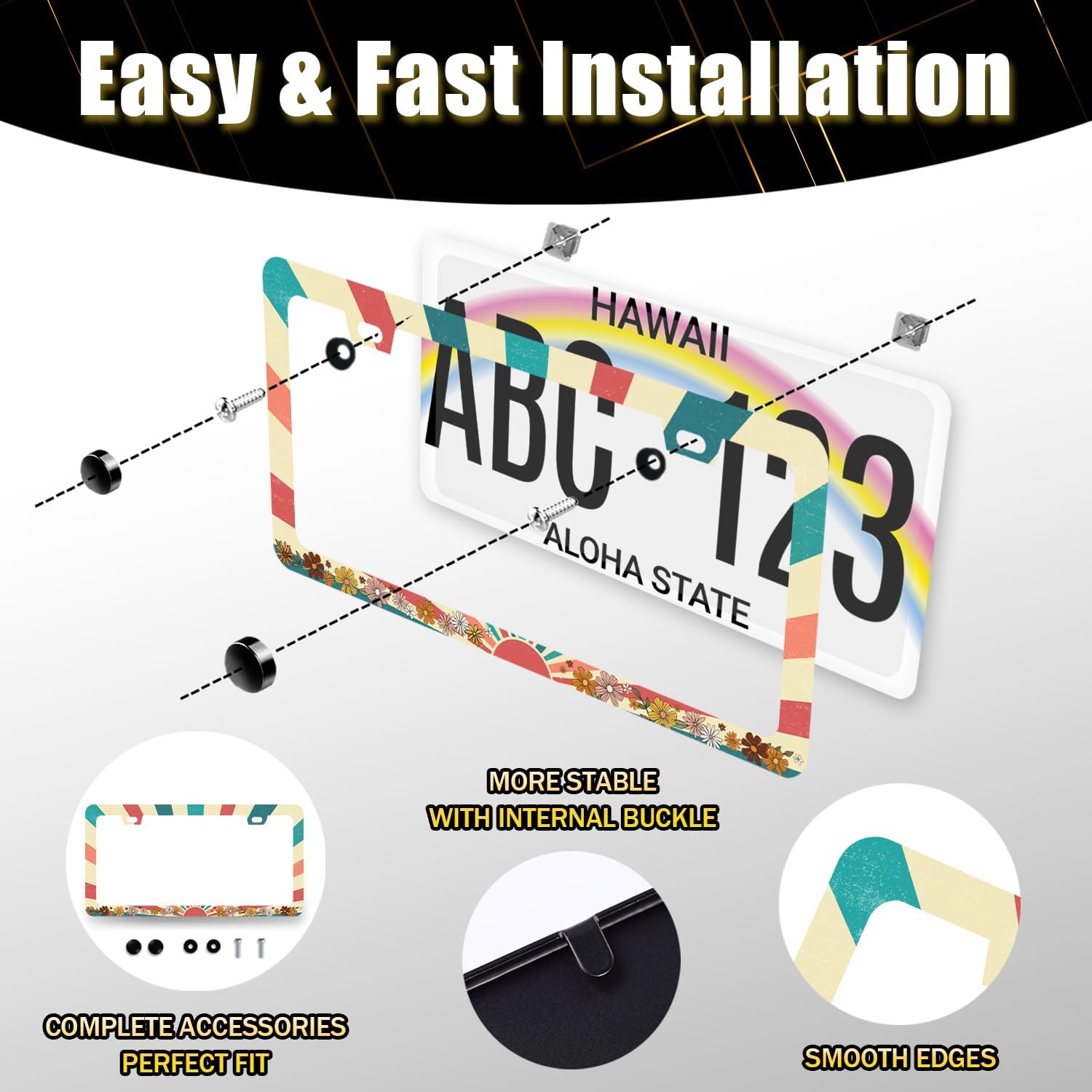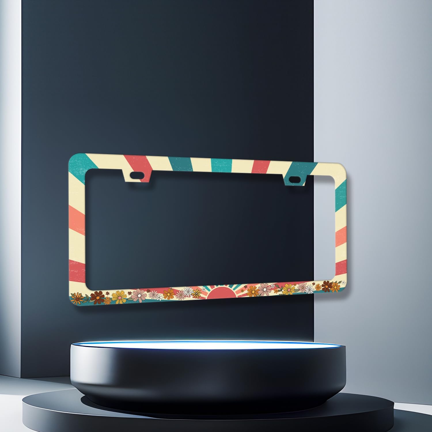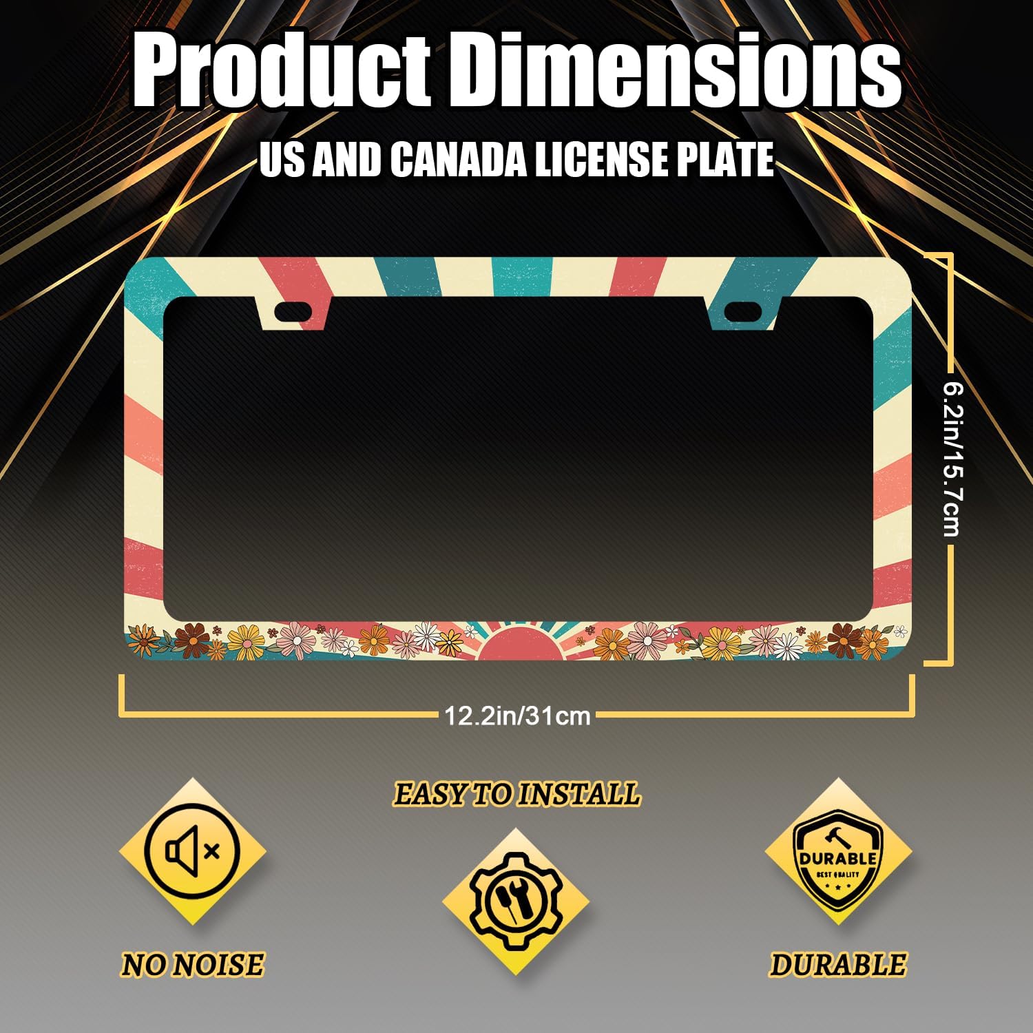 Retro Sun Boho Floral License Plate Frame Colorful Hippie Flowers License Plate Holder Funny License Plate Car Decoration Stainless Steel Car Accessory with Screws Men Women 12.3" x 6.3"