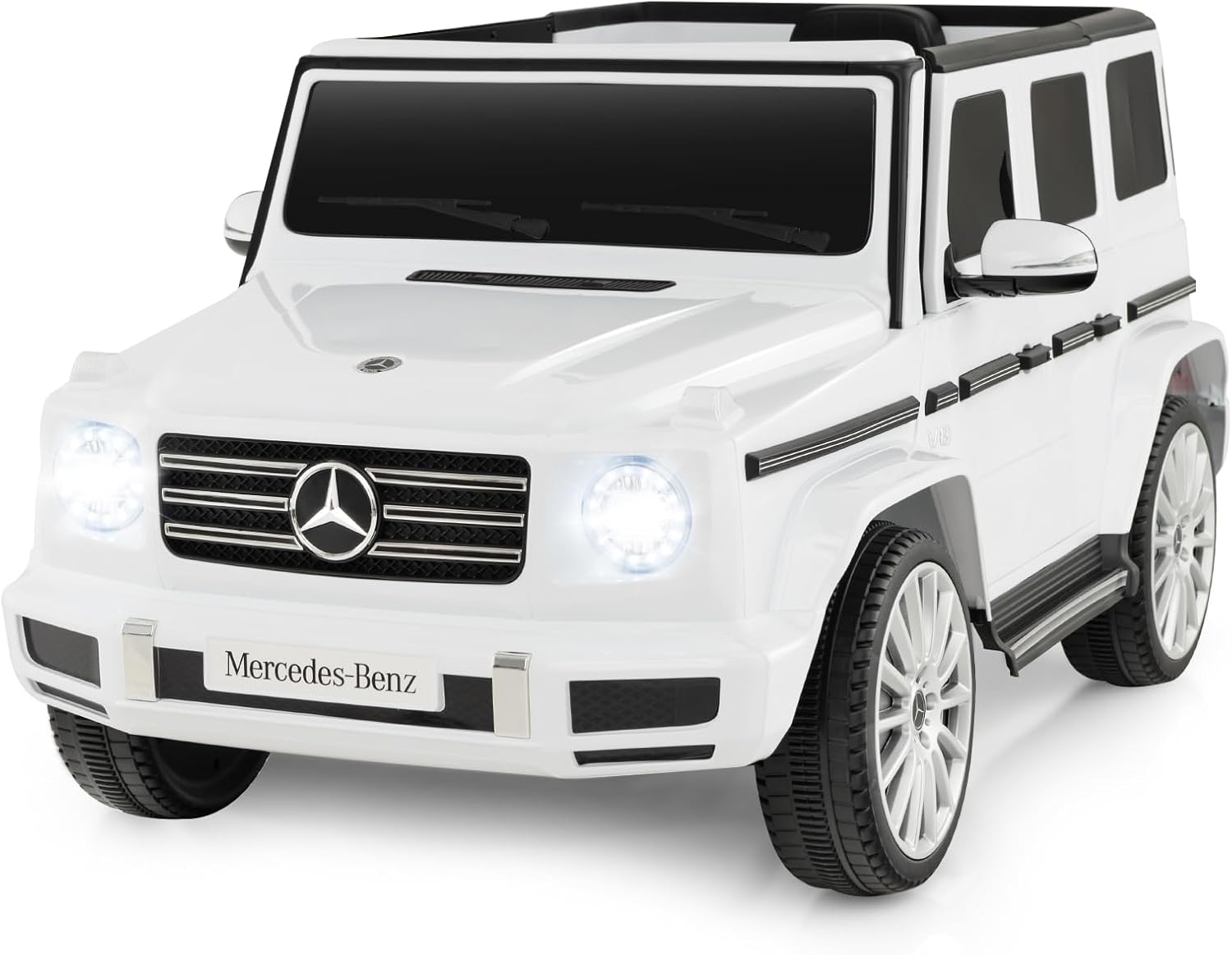 - 【12V Licensed Mercedes Benz G500】: This officially licensed Mercedes Benz ride on car has a realistic look, with super bright headlights, foldable rearview mirror, double lockable doors and true-to-life spare tire, making it the best gift for children 3+ years old.