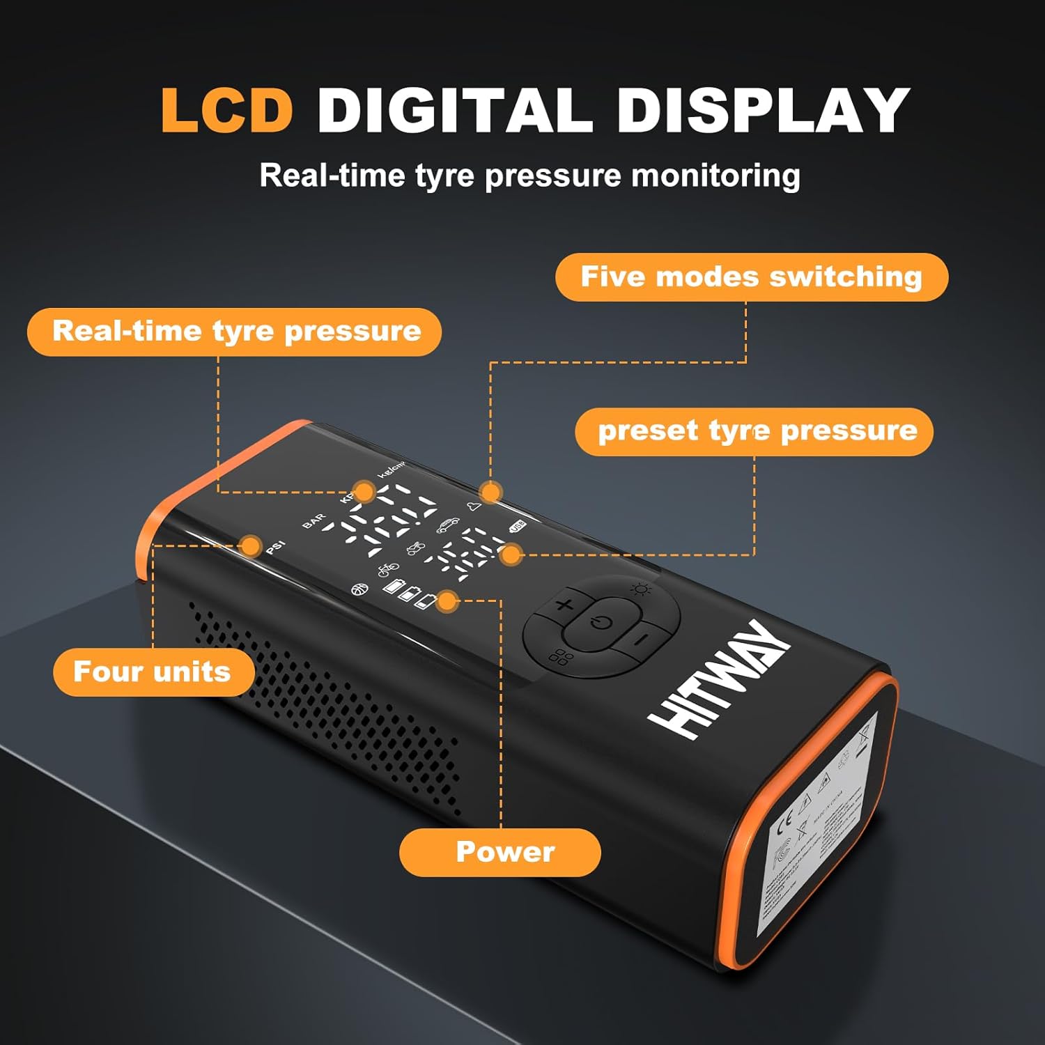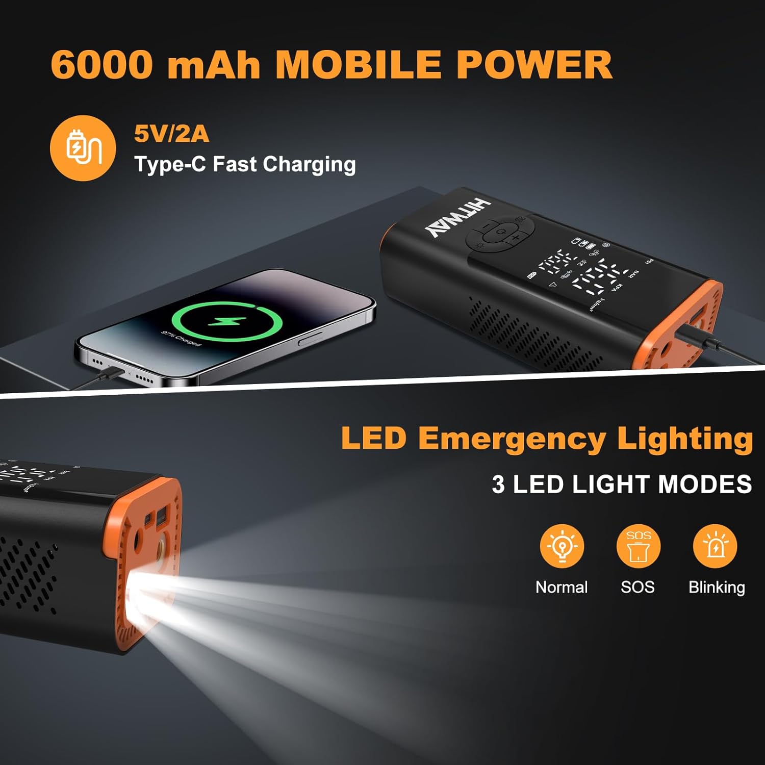 HITWAY Portable Electric Inflator Pump Supports up to 150PSI, fast inflation, suitable for car, motorcycle, bicycle tires and sports equipment, LCD display screen, USB charging, built-in LED light