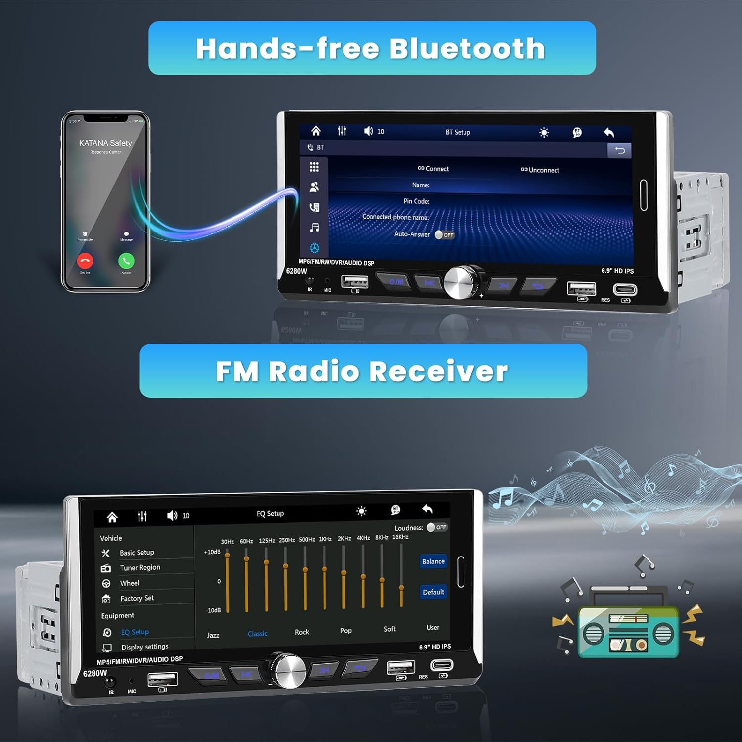 - ăFM/RDS Radio & EQ & BluetoothăOur single din car stereo supports fully automatic channel search for music, news bulletins and traffic information anytime, anywhere. It also supports multiple equalization modes and adjustable bass and treble. Besides, it has built-in Bluetooth and external microphone, which allows you to answer calls via Bluetooth stereo, and the microphone makes your voice clearer