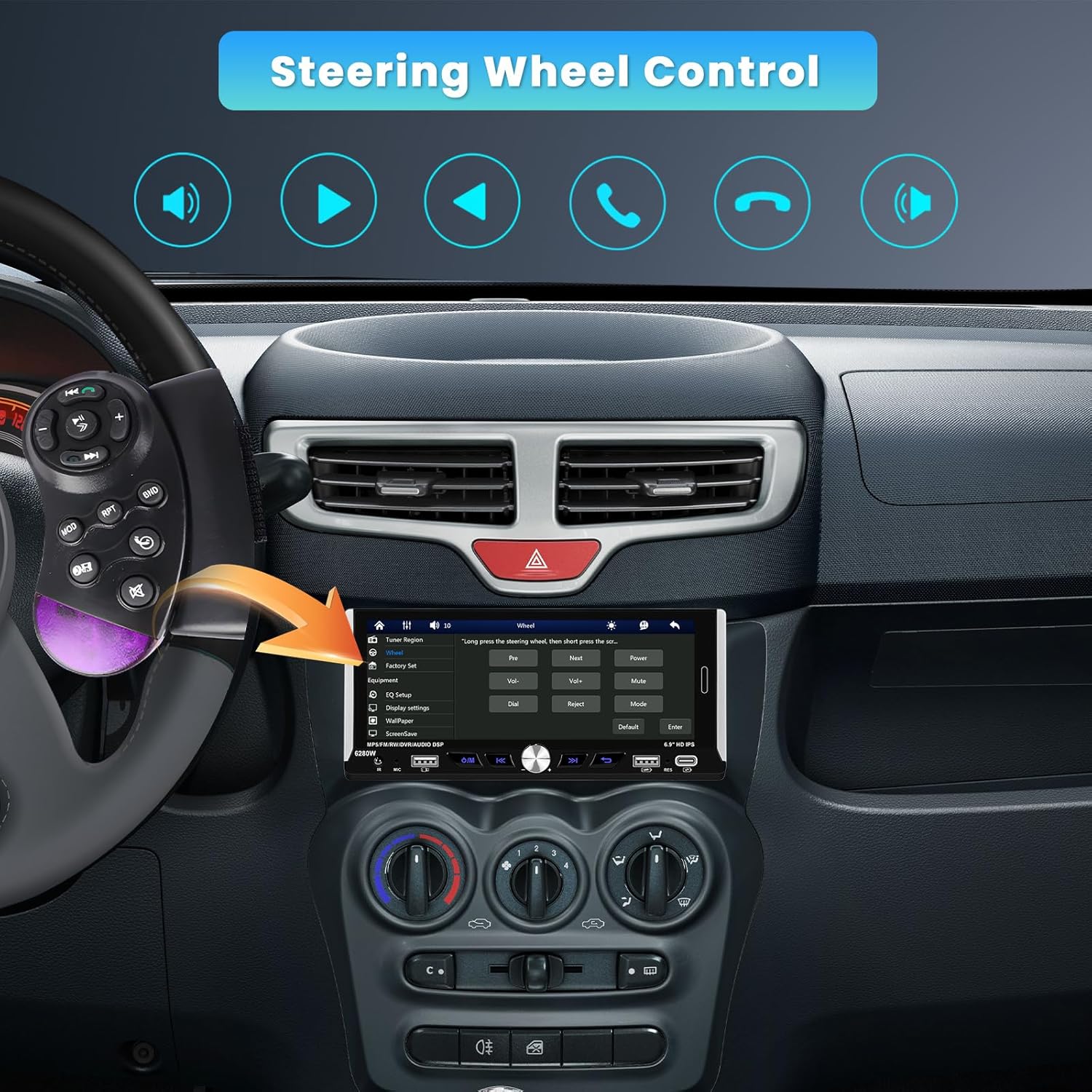 - ăHD Backup Camera & Steering Wheel ControlsăEquipped with a 170° viewing angle HD waterproof backup camera, the single din car head unit automatically displays a clear image when reversing. Steering wheel functions are programmed to work flawlessly, allowing you to focus on driving for increased safety and convenience