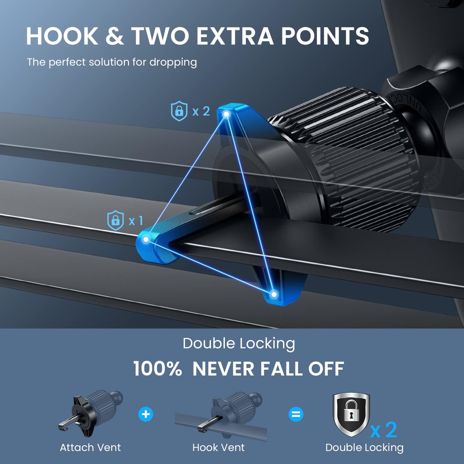 - ăNever Fall Off-Metal Hook DesignăCar phone holder mount features an upgraded metal hook with a thick plastic layer wrapped around outside which firmly locking the vent blades without scratches. Phone mount for car is compatible with both horizontal and vertical vents, ensures stable even on sharp turns or bumpy roads.