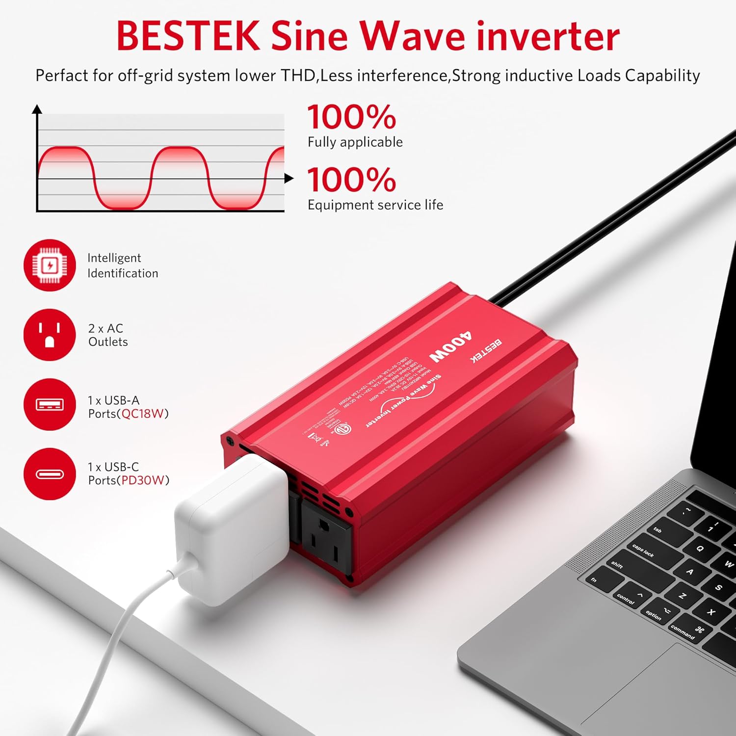 - BESTEK 400W T-Type Sine Wave Car Power Inverter: Its output waveform is delivers a smoothly for sensitive electronics provided by the electric utility, Perfects for off-grid system,Lower THD,Less wear, Strong inductive Loads Capability.Its waveform features a flattened peak, so we call it a T-type sine wave. Recommended for most electrical devices to extend battery life.