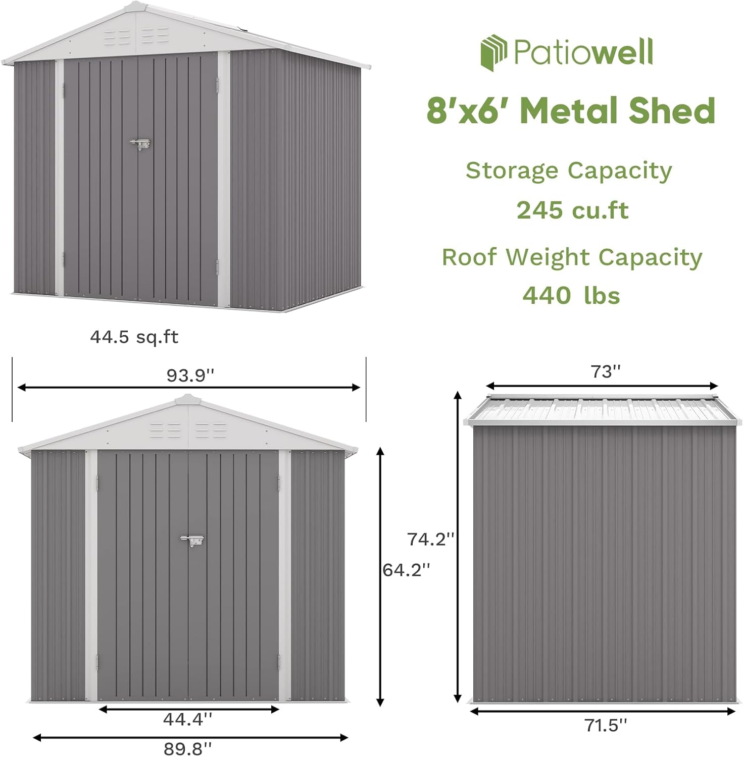 - Spacious Storage Space: 8x6 FT Overall Dimensions: 89.9” x 71.5” x 74.2” (L x W x H). And this metal tool shed has a large storage space inside, which can store most of the tools you will use in your daily life such as mowers, ladders, tool kits and other items to keep your yard clean. The design of the tall walls also allow for plenty of headroom to work, hang tools or stack something according to your needs.